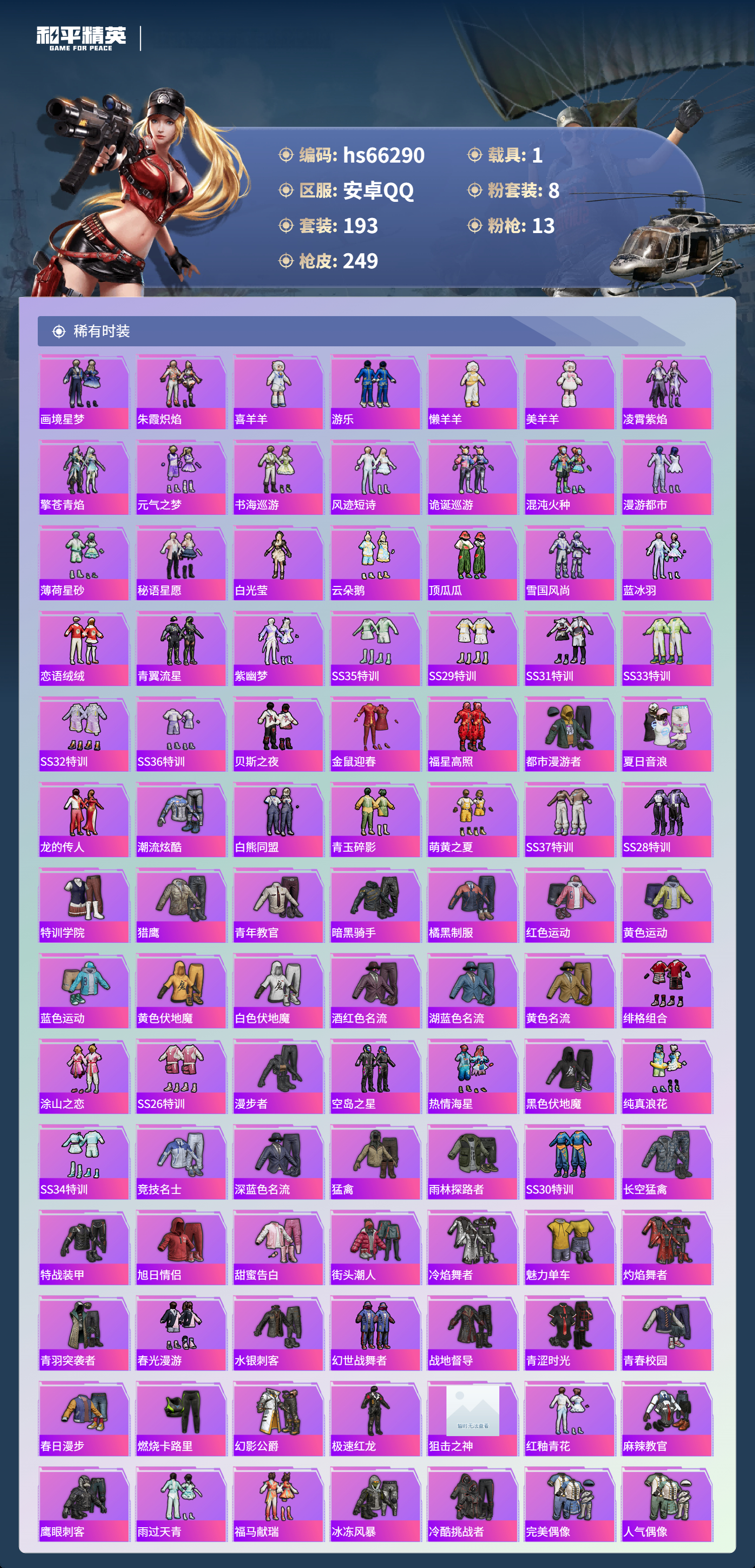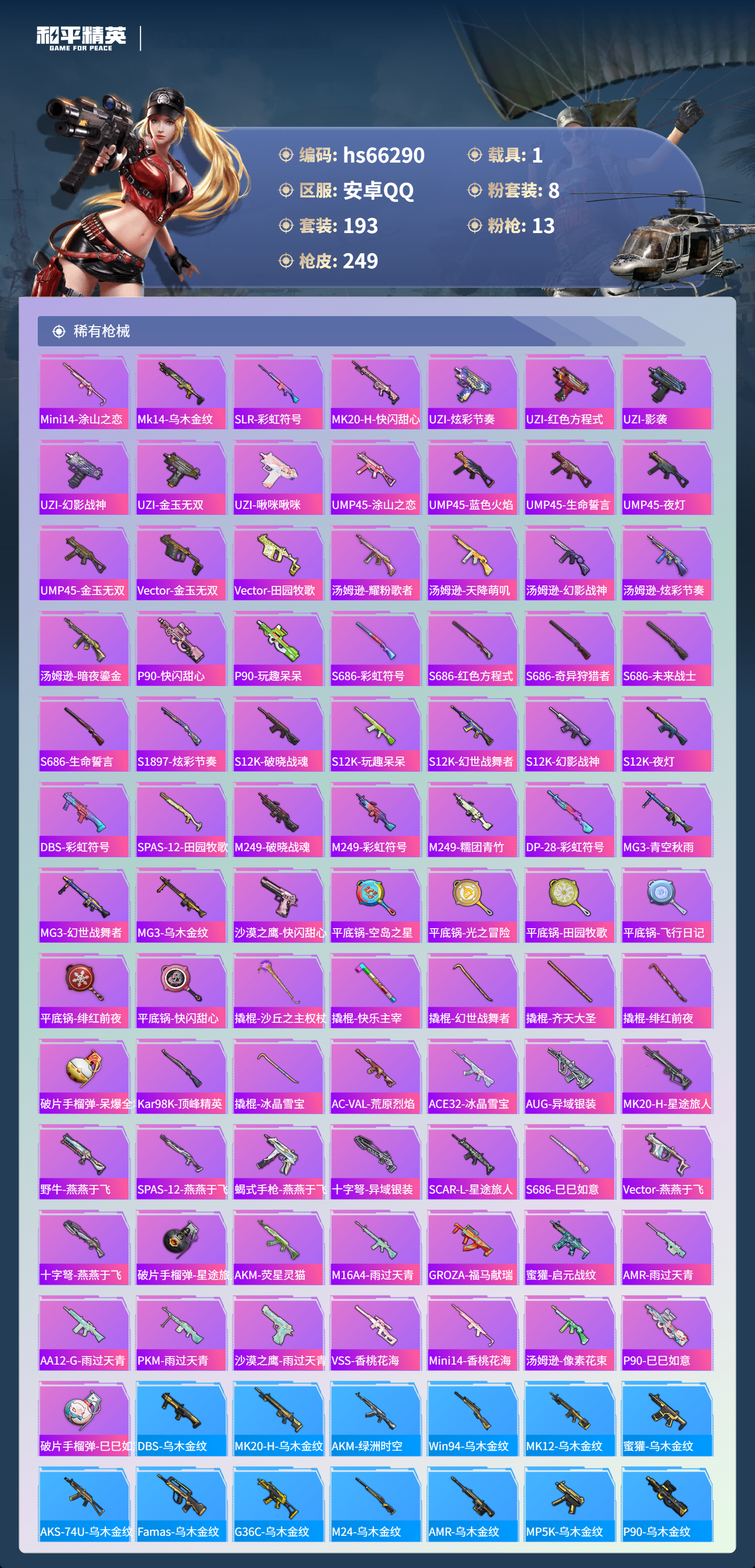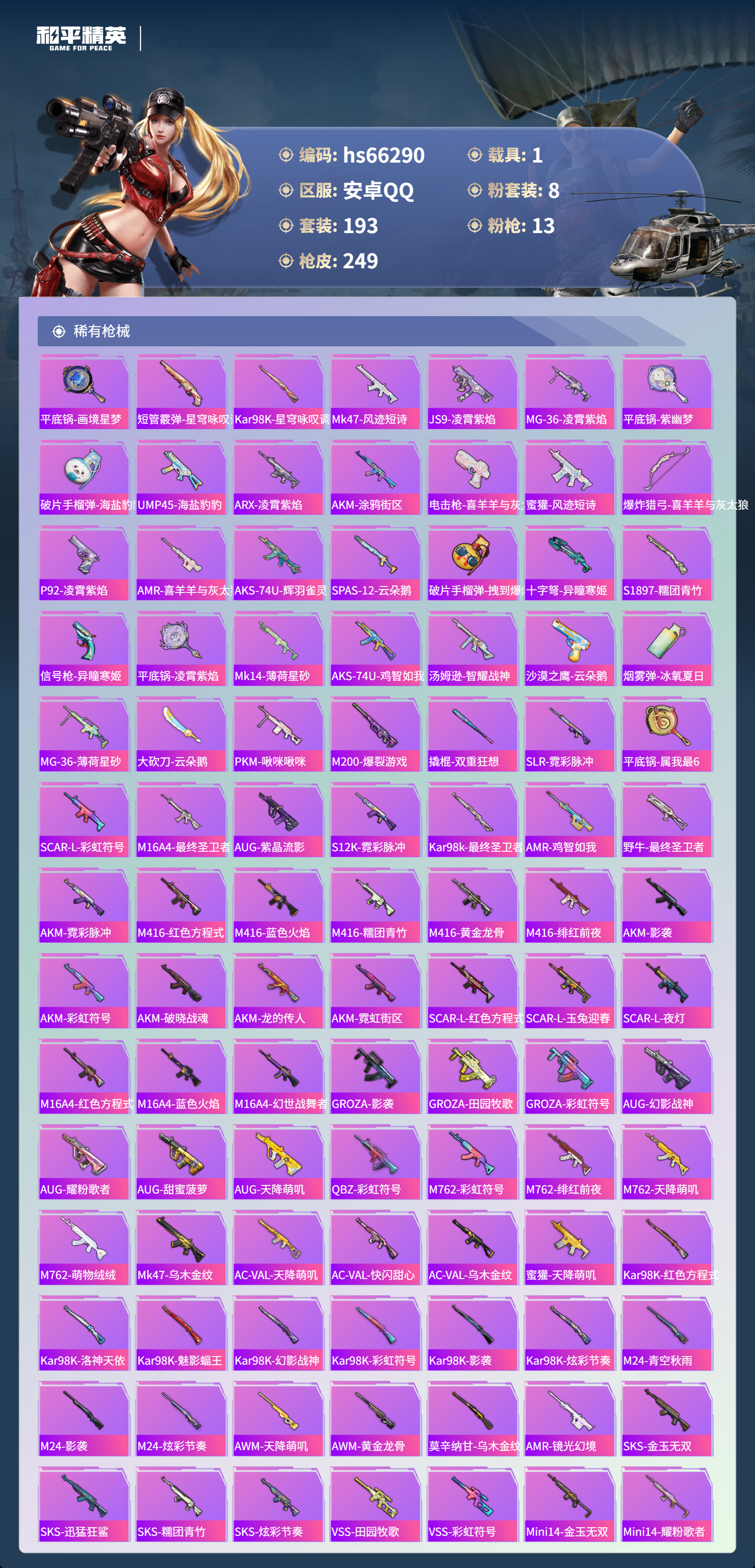 安卓手Q-14王牌印记-1红装-8粉装-13特效枪-1载具-79764热力值-1