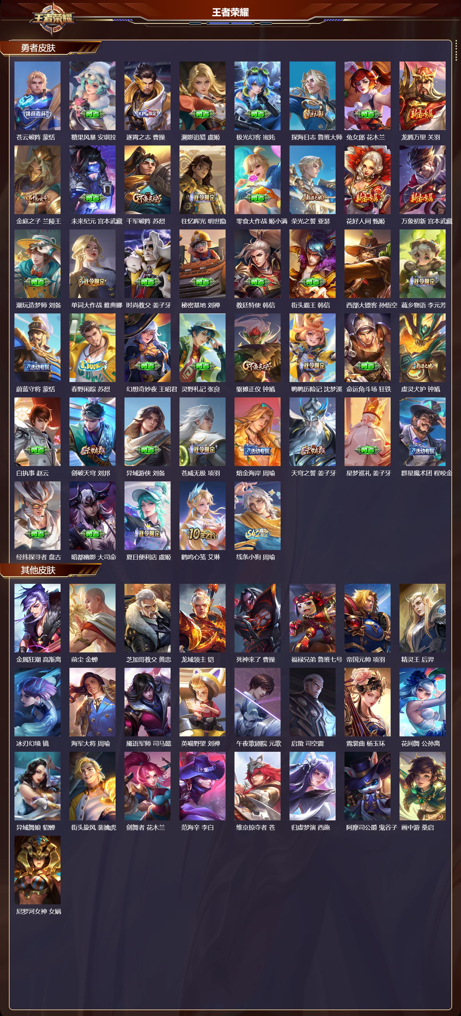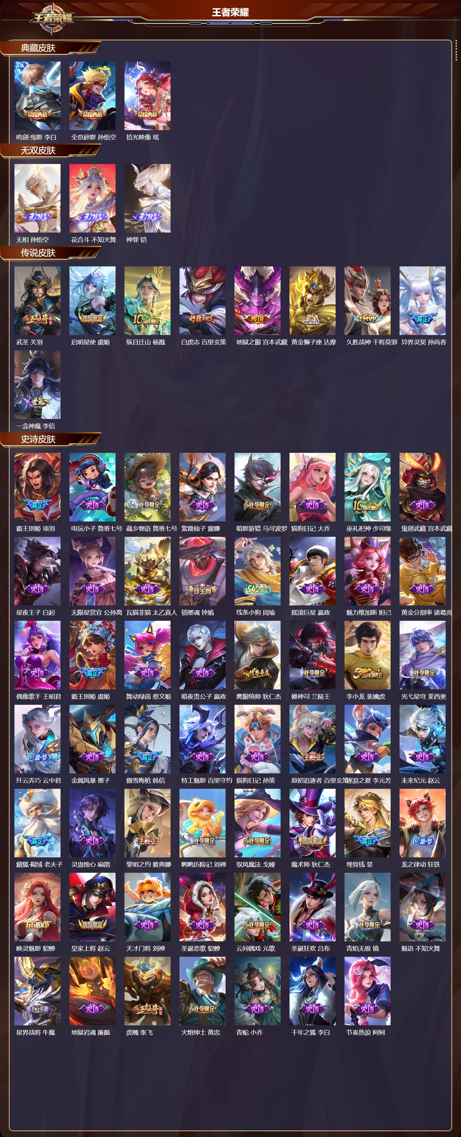 最强王者/223皮肤/127英雄/3典藏/0珍品无双/3无双/0珍品传说/9传说/69史诗/8稀有英雄