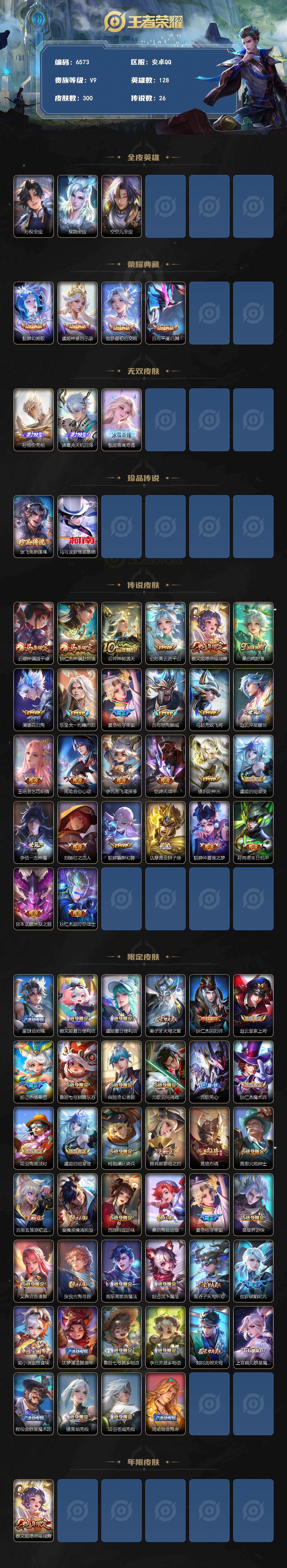 贵族等级9/荣耀典藏数量4/传说皮肤数量26/史诗皮肤数量89/皮肤数量300/英雄数量128/段位最强王者/孙权全皮/敖隐全皮/空空儿全皮/幻阙歌 貂蝉/神鉴启示录 虞姬/最初的交响 伽罗/吕布千魇归渊/孙悟空无相/天机白泽 诸葛亮/雪境奇遇 甄姬/兔狲·蓬尾 张飞/怪盗基德 马可波罗/云缨神骥越千峰/狄仁杰神骥赴朔漠/神树通天 后羿/云诺千山 公孙离/愿照·福禄聚 蔡文姬/鸣野蒿 桑启/逐