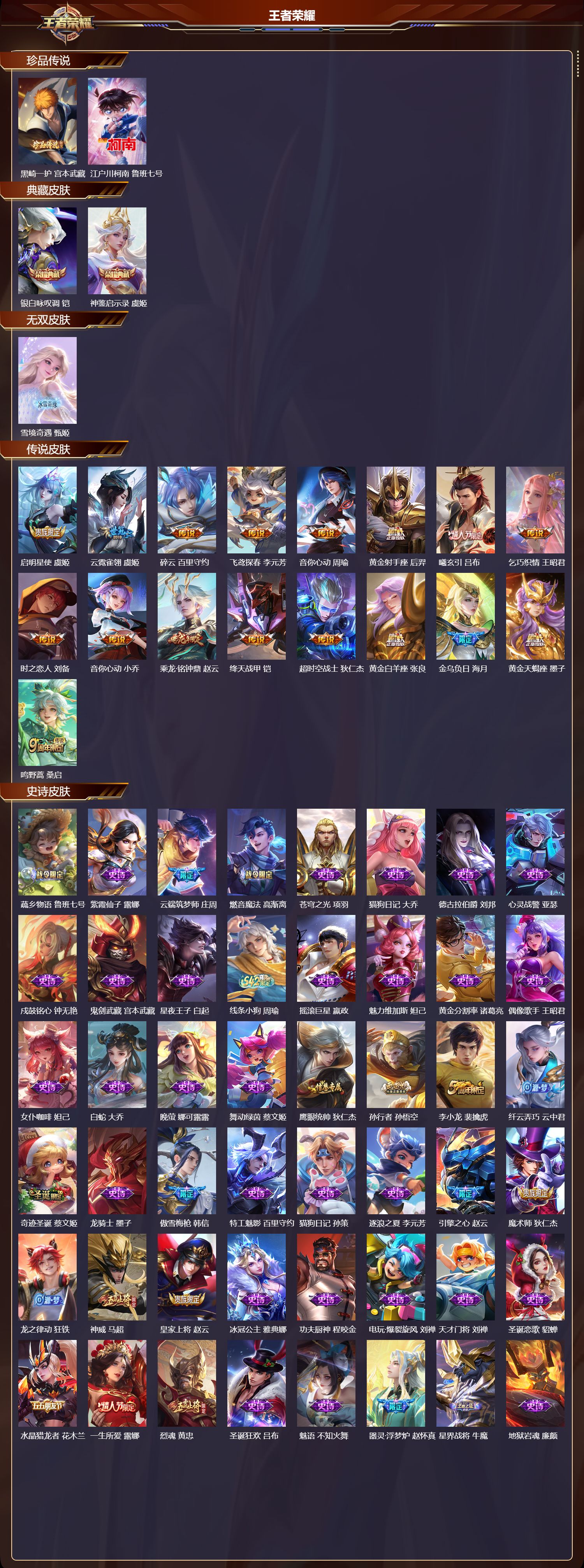 安卓QQ/荣耀王者/266皮肤/128英雄/2典藏/0珍品无双/1无双/2珍品传说/17传说/69史诗/9稀有英雄【2 珍品传说】黑崎一护 宫本武藏,江户川柯南 鲁班七号,【2 典藏皮肤】银白咏叹调 铠,神鉴启示录 虞姬,【1 无双皮肤】雪境奇遇 甄姬,【17 传说皮肤】启明星使 虞姬,云霓雀翎 虞姬,碎云 百里守约,飞鸢探春 李元芳,音你心动 周瑜,黄金射手座 后羿,曦玄引 吕布,乞巧织情 王昭