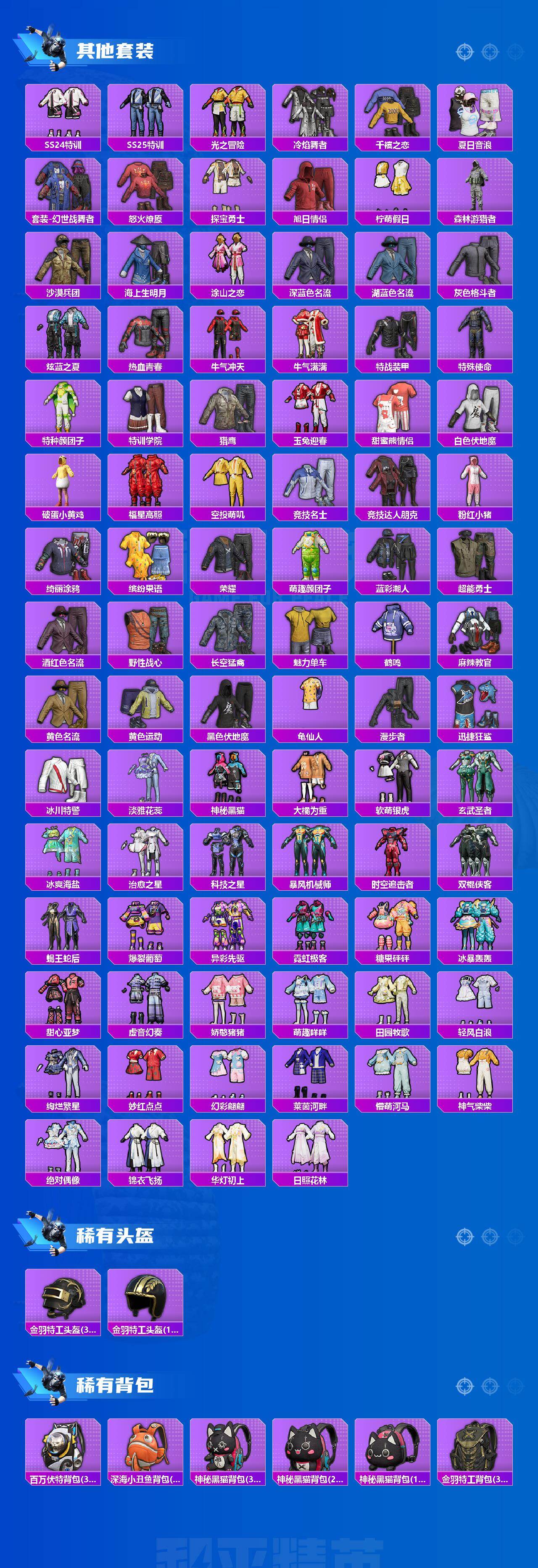 粉装6/粉枪5/载具2/珍稀飞行器72244/套装126/枪皮189/热力值58673/历史最高段位:王牌印记14次/Lv:68/七级AKM-梦之光华/五级Kar98K-巳巳如意/一级Mk14-福马献瑞/五级DP-28-豹影疾电/套装-龟仙人/套装-粉红小猪/香水柠檬/蝶舞蔷薇/流星咚咚/酣梦娃娃/闲梦青缨/角色-智耀战神/特斯拉Roadster(水滴蓝)/兰博基尼Estoque(银翼灰)/A