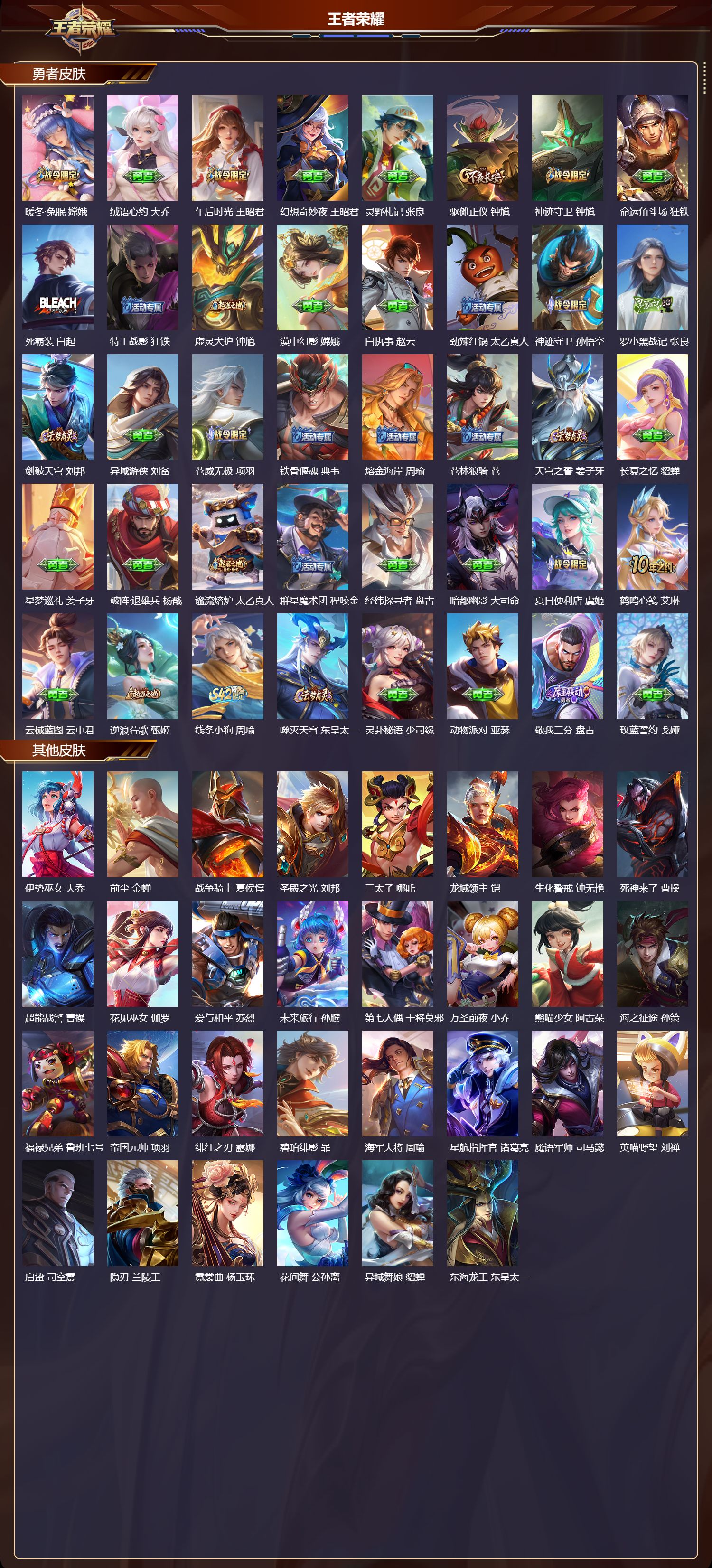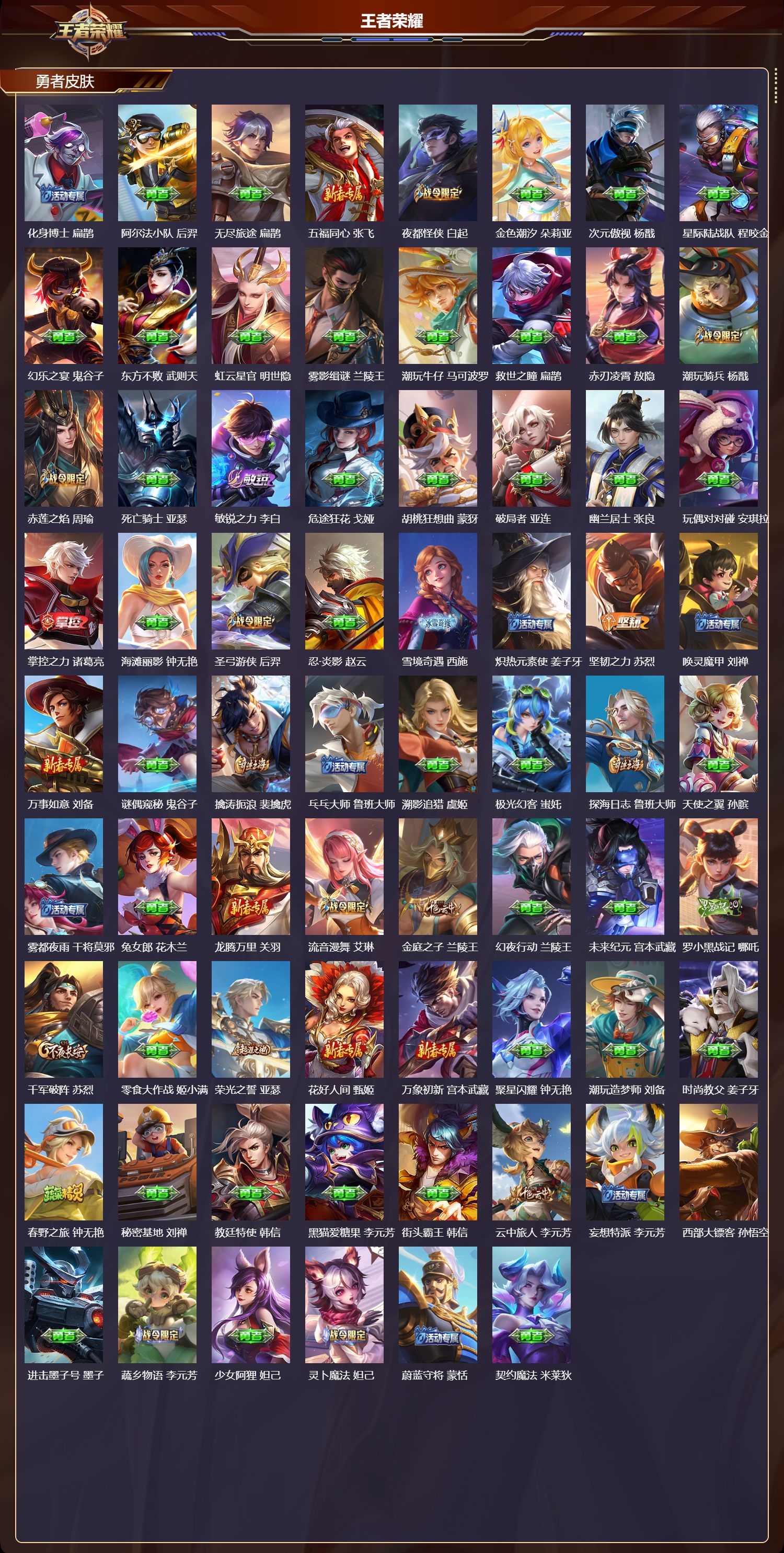 安卓QQ/荣耀王者/379皮肤/128英雄/4典藏/0珍品无双/0无双/0珍品传说/29传说/123史诗/9稀有英雄【4 典藏皮肤】杀手不太冷 孙尚香,弑枪猎影 韩信,无限飓风号 夏侯惇,拾光映像 瑶,【29 传说皮肤】星穹之声 王昭君,启明星使 虞姬,前尘镜 娜可露露,无限倾心 虞姬,花朝如约 蔡文姬,碎云 百里守约,逐花归海 澜,时之祈愿 瑶,飞鸢探春 李元芳,无双飞将 马超,李逍遥 曜,深