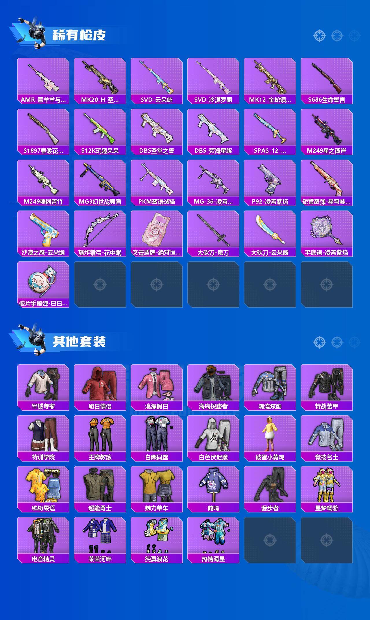【粉色枪皮等级】:ACE32-萌骑漫游(四级),P90-沙丘之主(三级),P90-冷漠罗丽(七级),Kar98K-巳巳如意(五级),Kar98K-圣域龙灵(三级),Mk14-福马献瑞(四级),AMR-智耀战神(六级),MK12-雪月幻音(四级),DP-28-豹影疾电(五级)