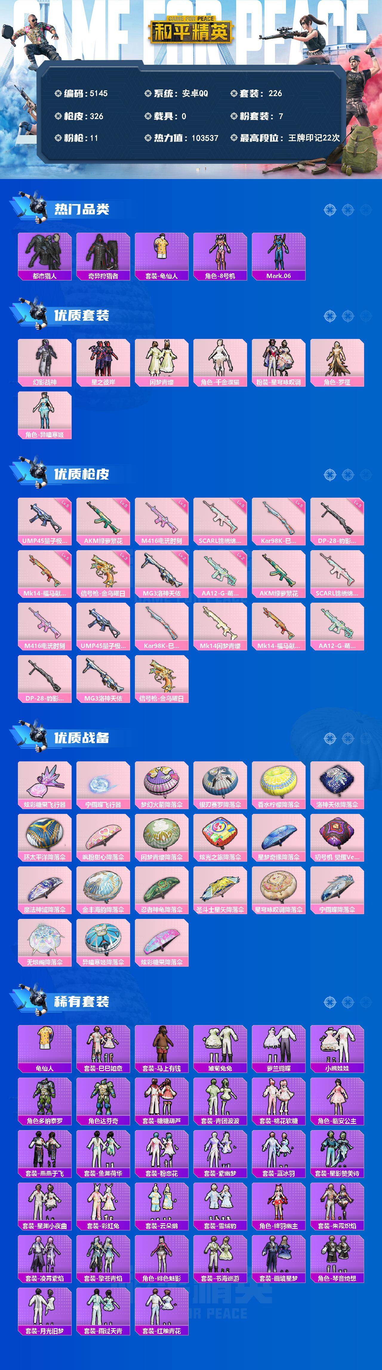 粉装7/粉枪11/珍稀飞行器,/套装226/枪皮326/热力值/历史最高段位:王牌印记22次/Lv:74/五级AKM-绿萝繁花/五级SCAR-L-锦绣绵绵/五级M416-电玩时刻/五级UMP45-量子极限/五级Kar98K-巳巳如意/五级Mk14-福马献瑞/二级AA12-G-萌骑幻想/五级DP-28-豹影疾电/二级MG3-洛神天依/三级信号枪-金乌曜日/都市