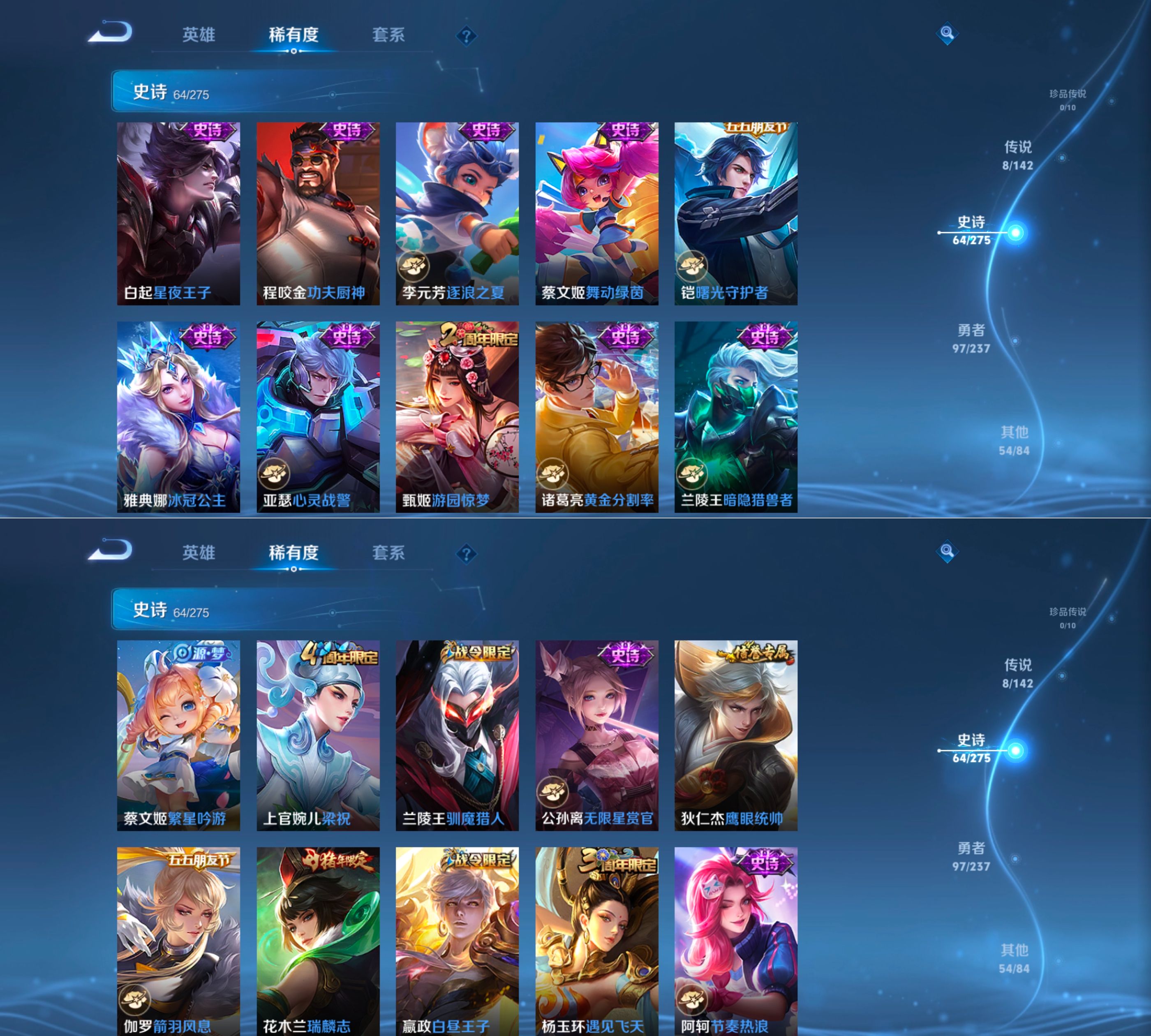【史诗皮肤】 地狱岩魂 涂山容容 光弋星穹 龙之律动 冰锋战神 如梦令 瑞麟志 烈魂 天狼绘梦者 至尊宝 遇见神鹿 死神来了 线条小狗 舞动绿茵 幽灵船长 繁星吟游 功夫厨神 女仆咖啡 魅力维加斯 魔术师 鹰眼统帅 圣诞恋歌 箭羽风息 无限星赏