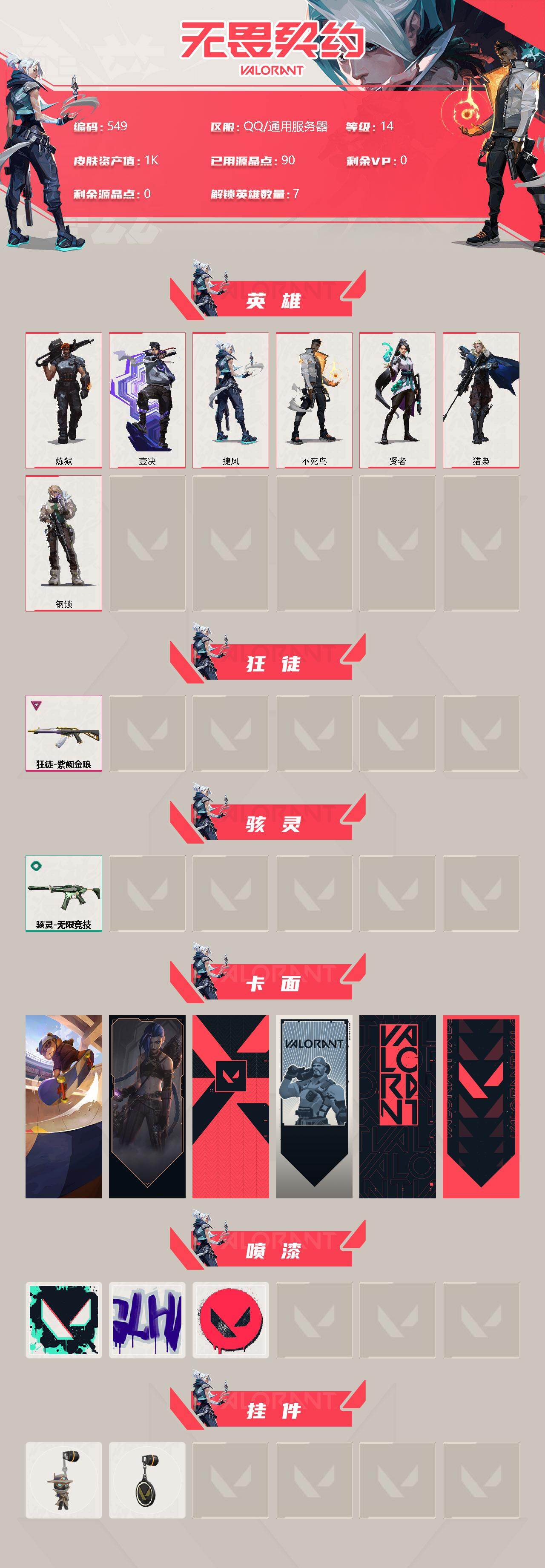 【英雄】:炼狱,壹决,捷风,不死鸟,贤者,猎枭,钢锁【狂徒】:狂徒-紫阙金琅【骇灵】:骇灵-无限竞技【卡面】:Clutch 卡面,《双城之战》金克丝 卡面,代号红色 卡面,新兵报到 卡面,V契约 卡面,无畏契约 卡面【喷漆】:胜利属于无畏契约 喷漆,GLHF 喷漆,无畏契约 喷漆【挂饰】:无畏契约GO!第一卷 零 挂饰,无畏契约 纪念币 挂饰