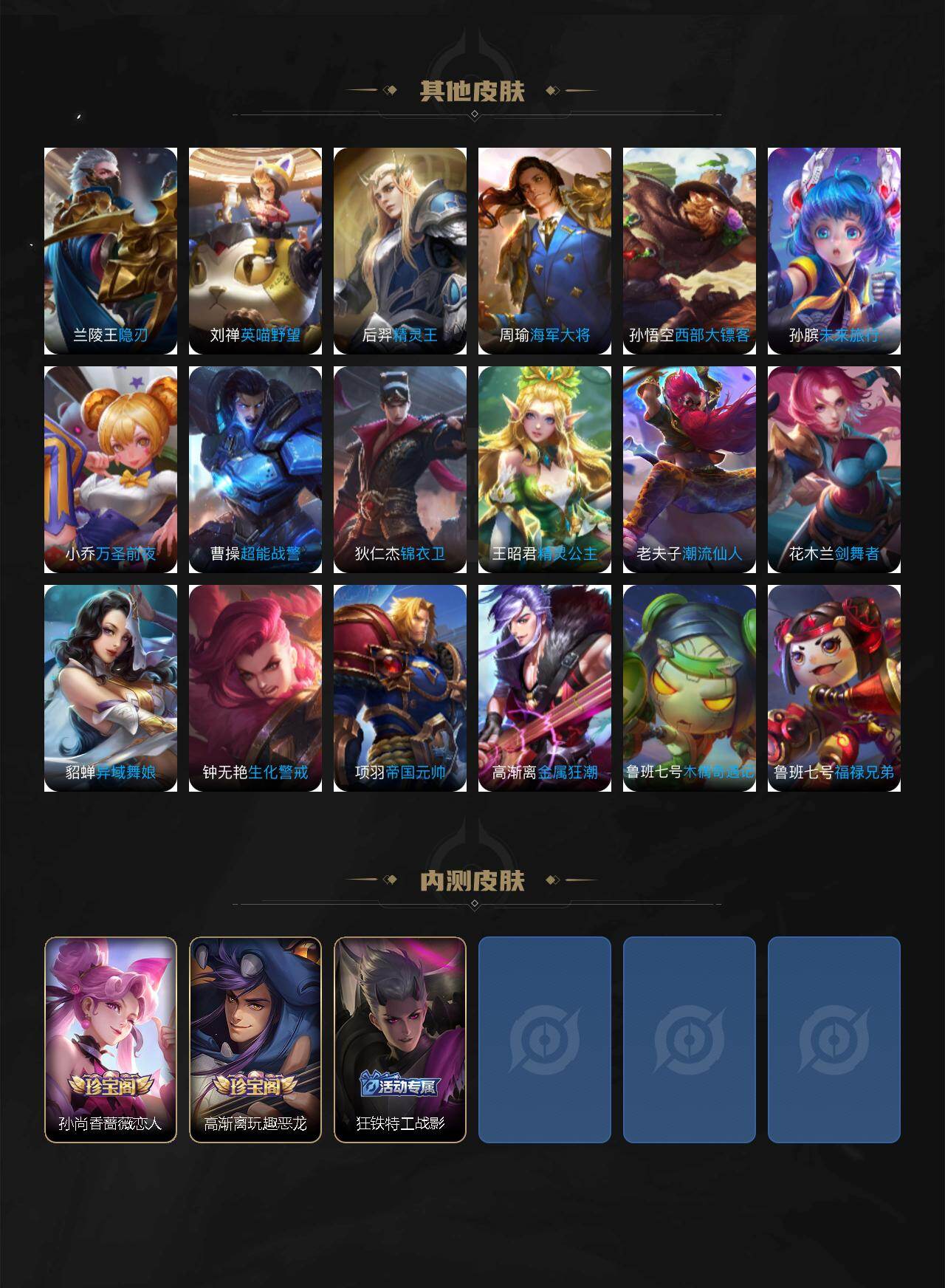 【传说皮肤】:后羿神树通天,司空震愿照山河定,澜愿照九州拓,桑启鸣野蒿,典韦战鼓燎原,澜逐花归海,夏洛特浮生妄,孙悟空齐天大圣,吕布怒海麟威,马超无双飞将,周瑜音你心动,李元芳飞鸢探春,镜炽阳神光,虞姬启明星使,孙悟空零号赤焰,干将莫邪久胜战神,达摩黄金狮子座,后羿黄金射手座,宫本武藏地狱之眼,孙悟空地狱火