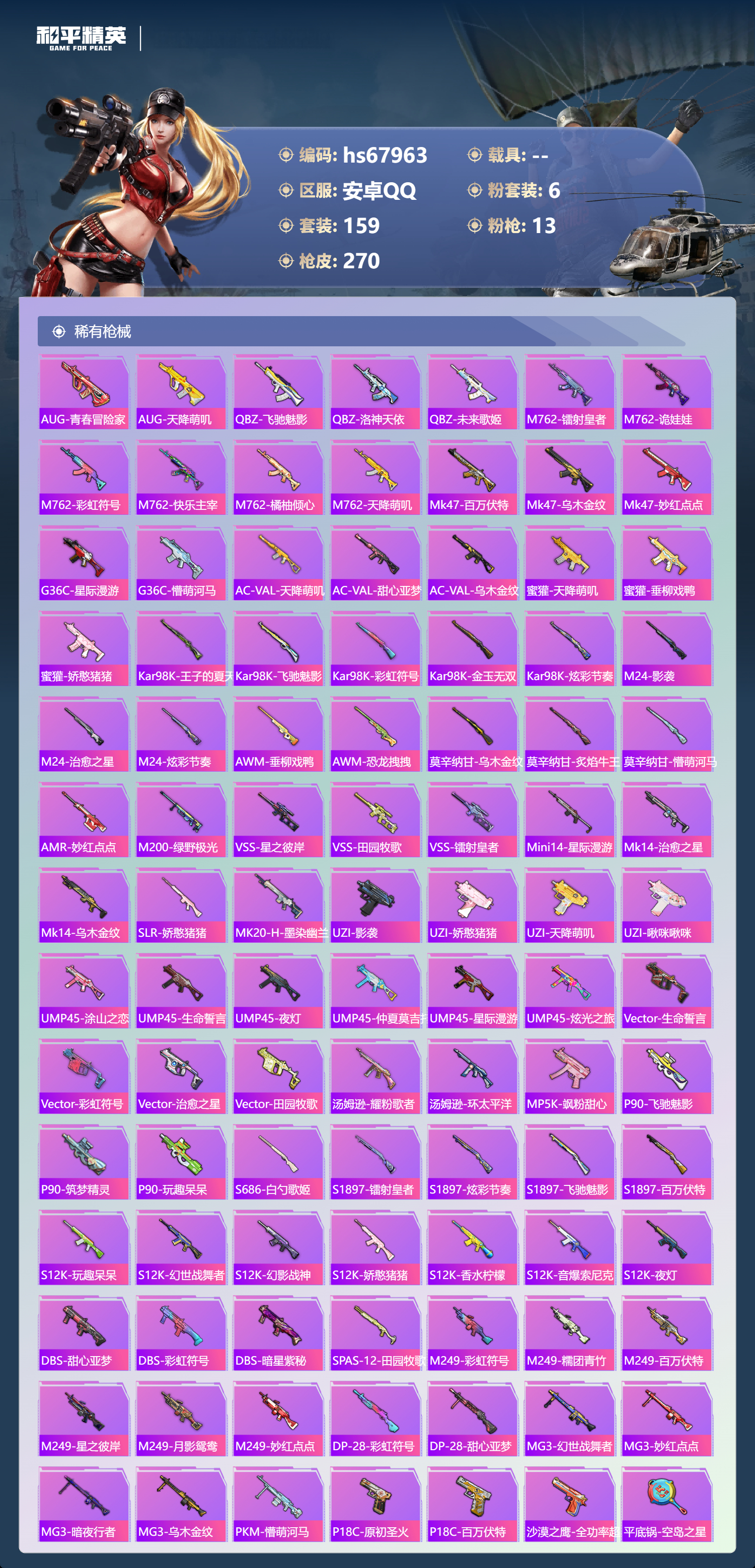 hs67963 安卓手Q-15王牌印记-6粉装-13特效枪-76228热力值-159套装-270枪皮-4卓越印记-1传奇印记