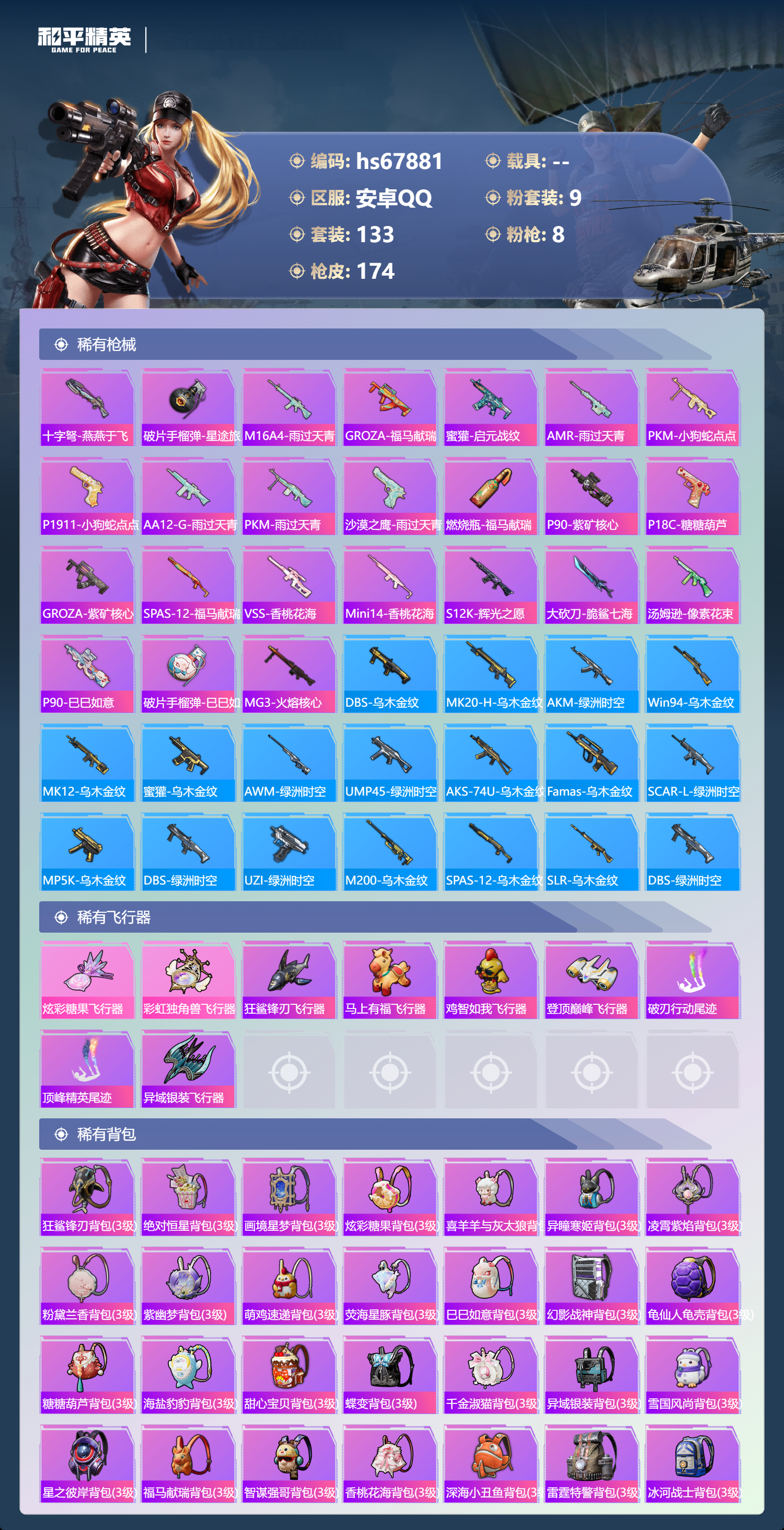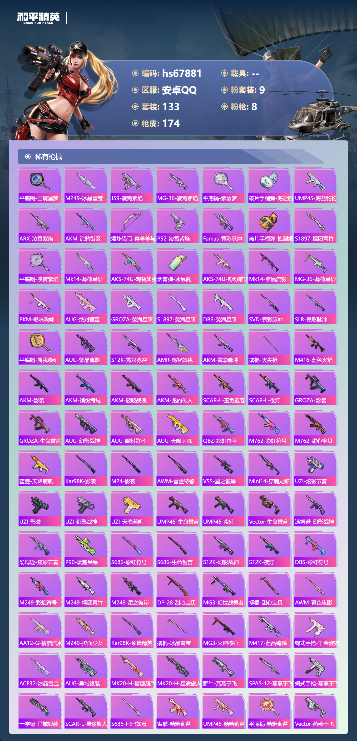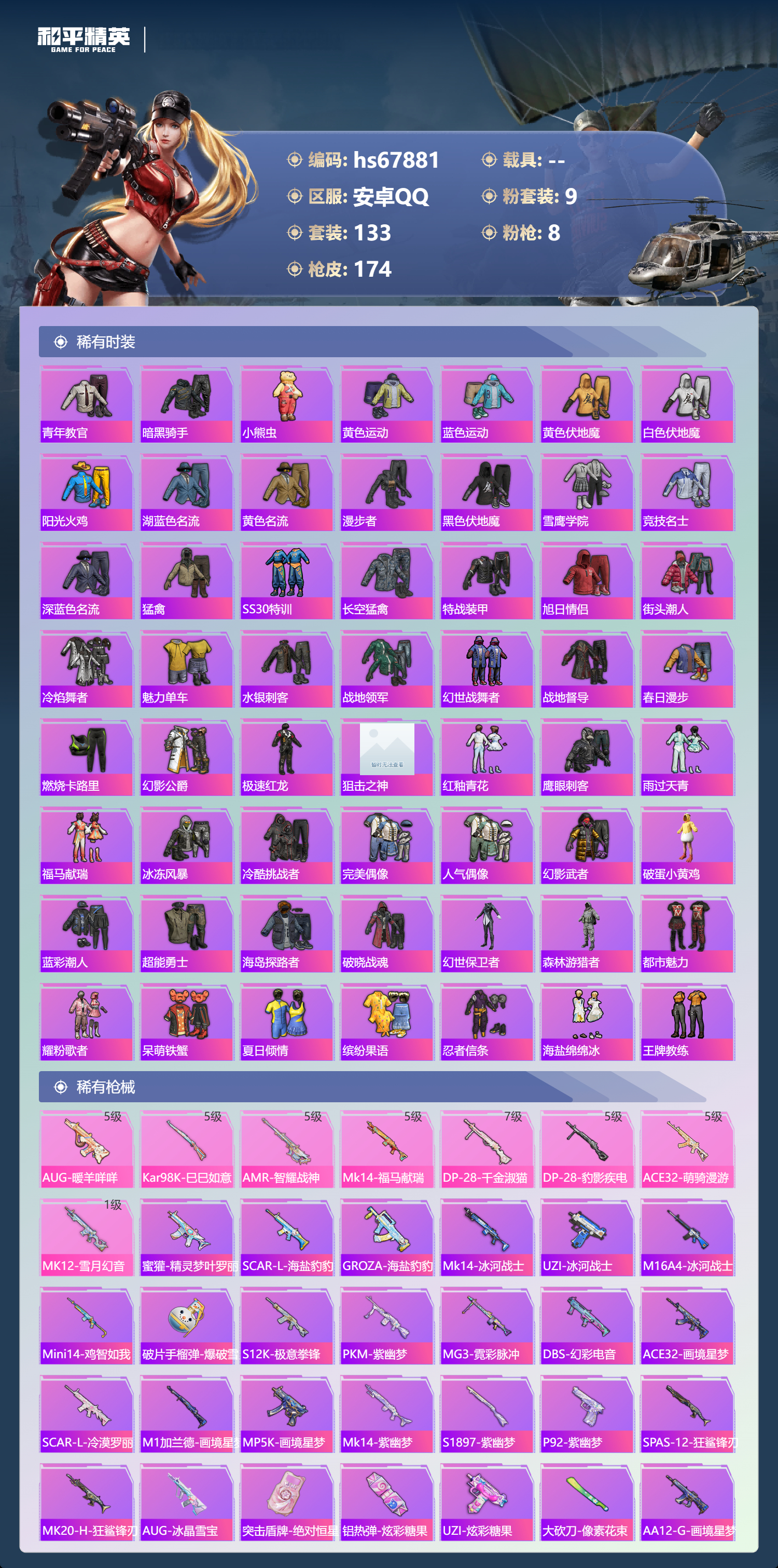hs67881 安卓手Q-1王牌印记-9粉装-8特效枪-49173热力值-133套装-174枪皮