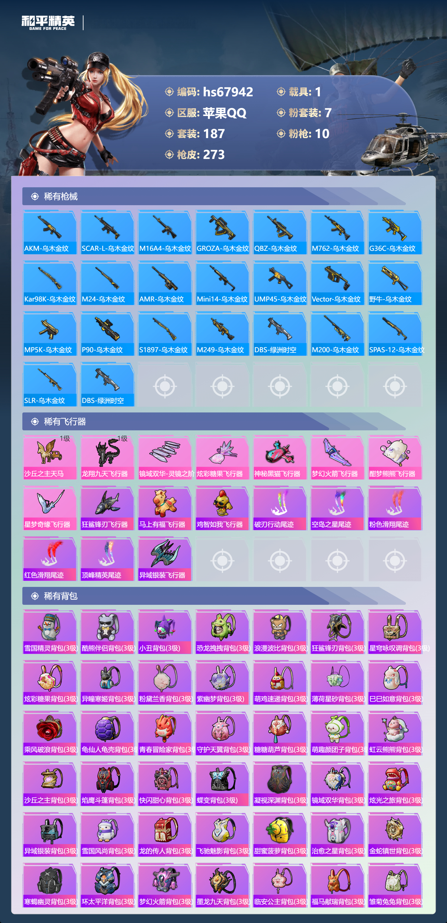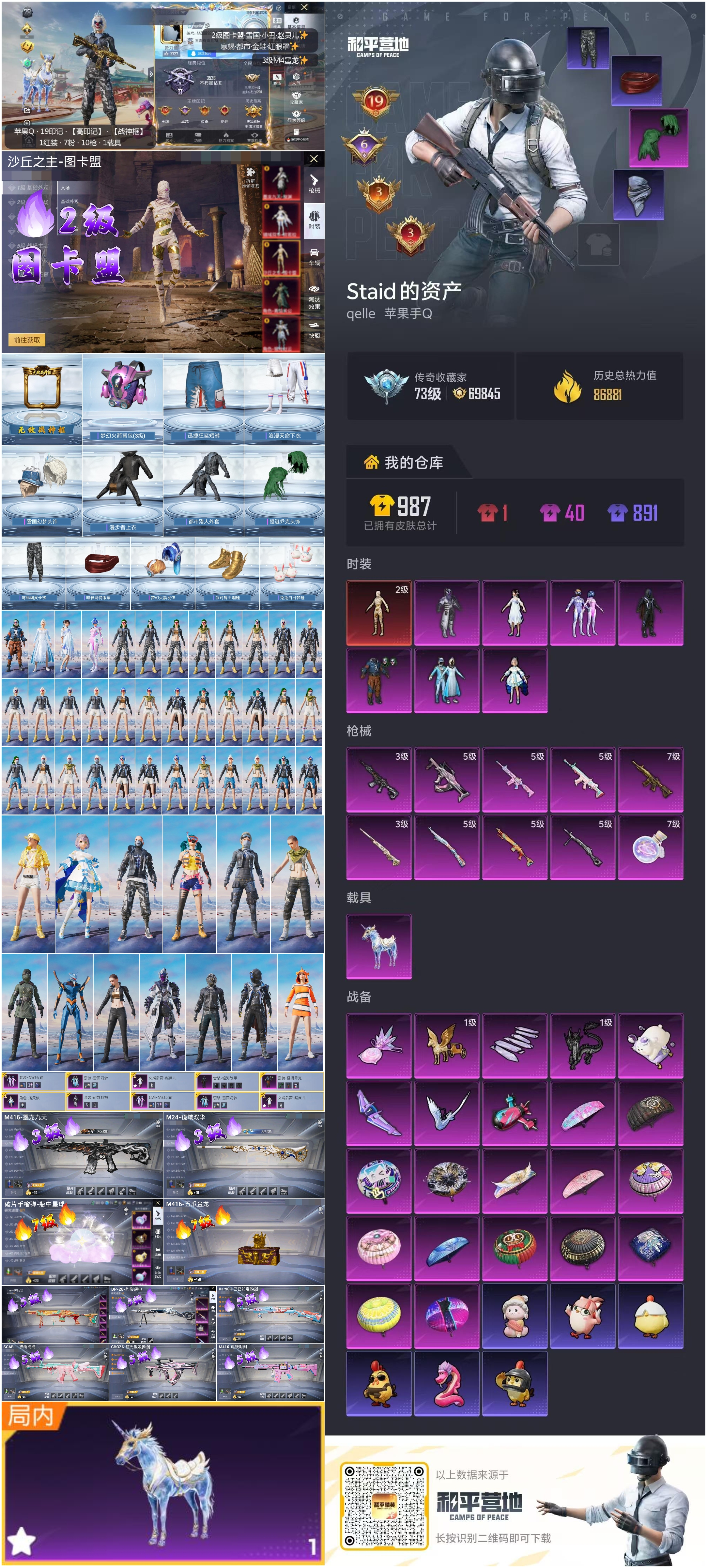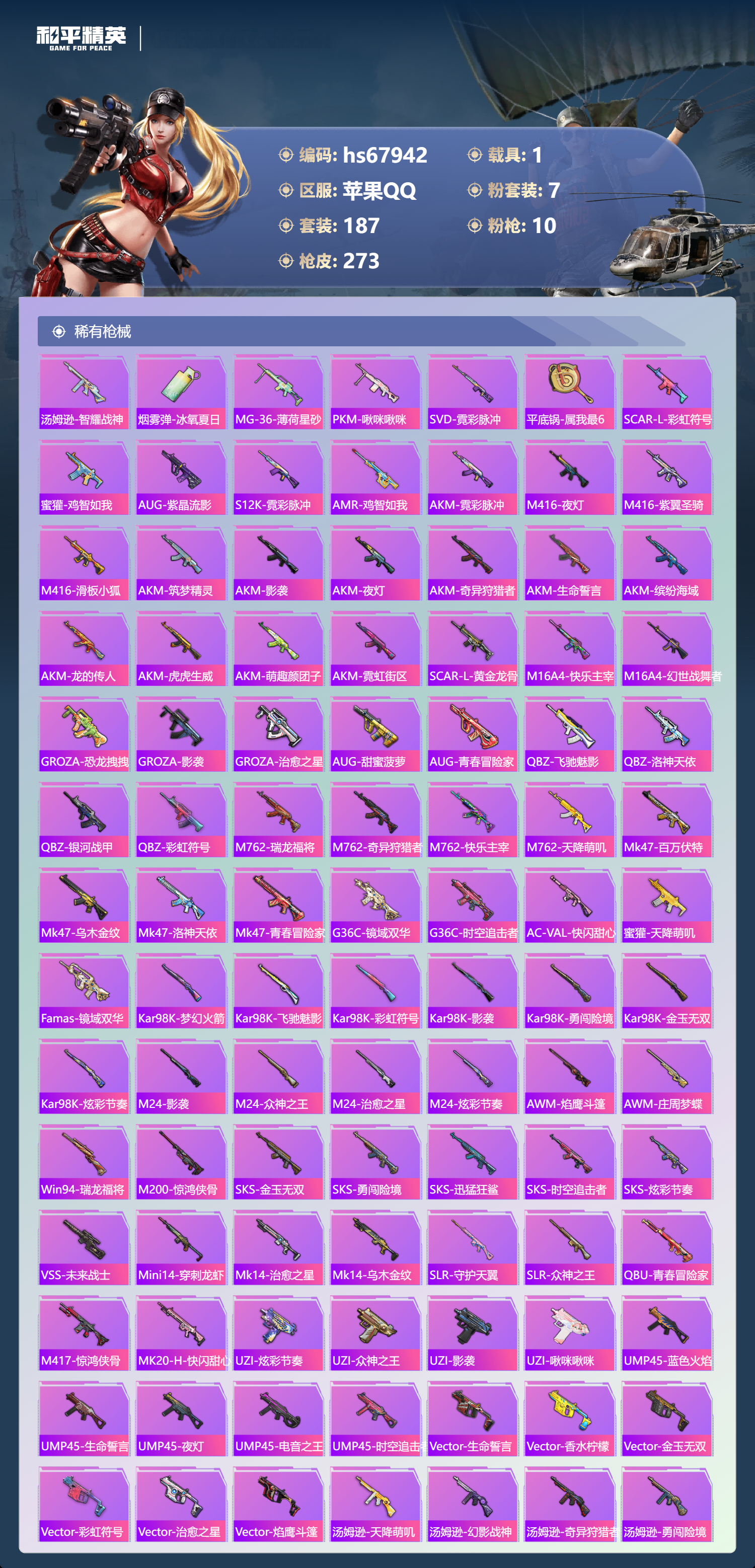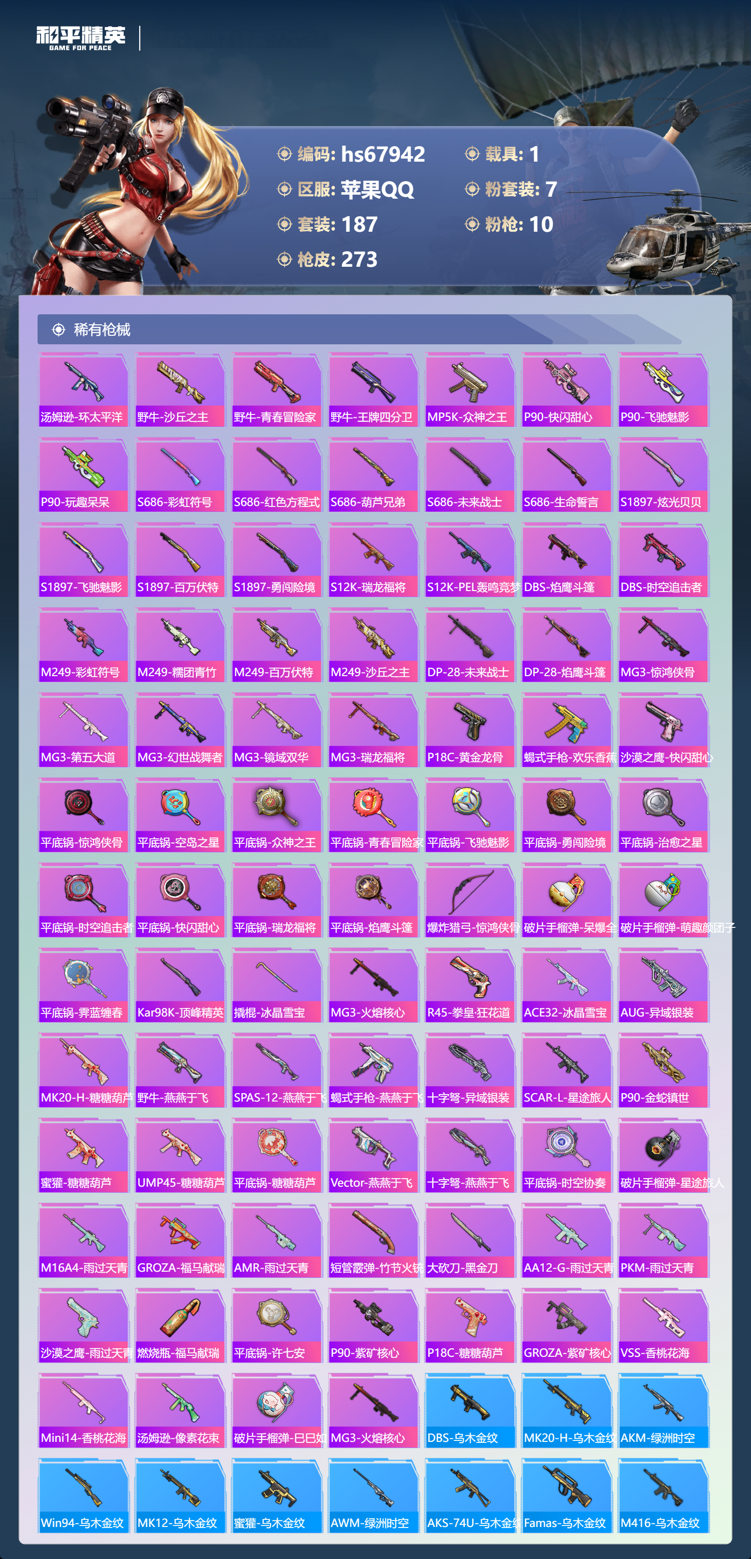 hs67942 苹果手Q-19王牌印记-有战神框-1红装-7粉装-10特效枪-1载具-86881热力值-187套装-273枪皮-6卓越印记-3传奇印记
