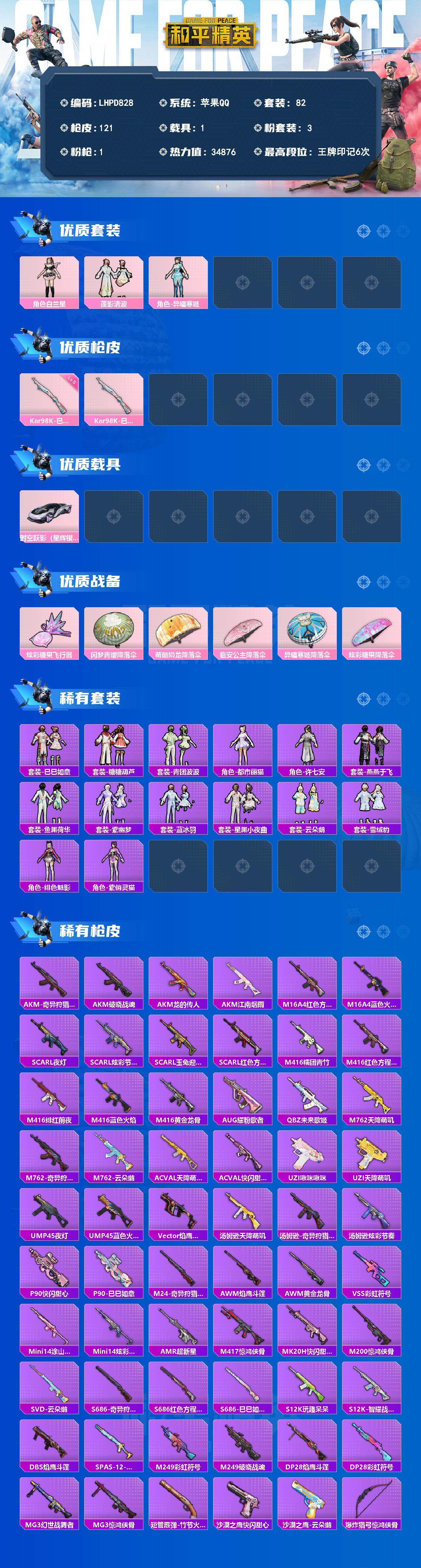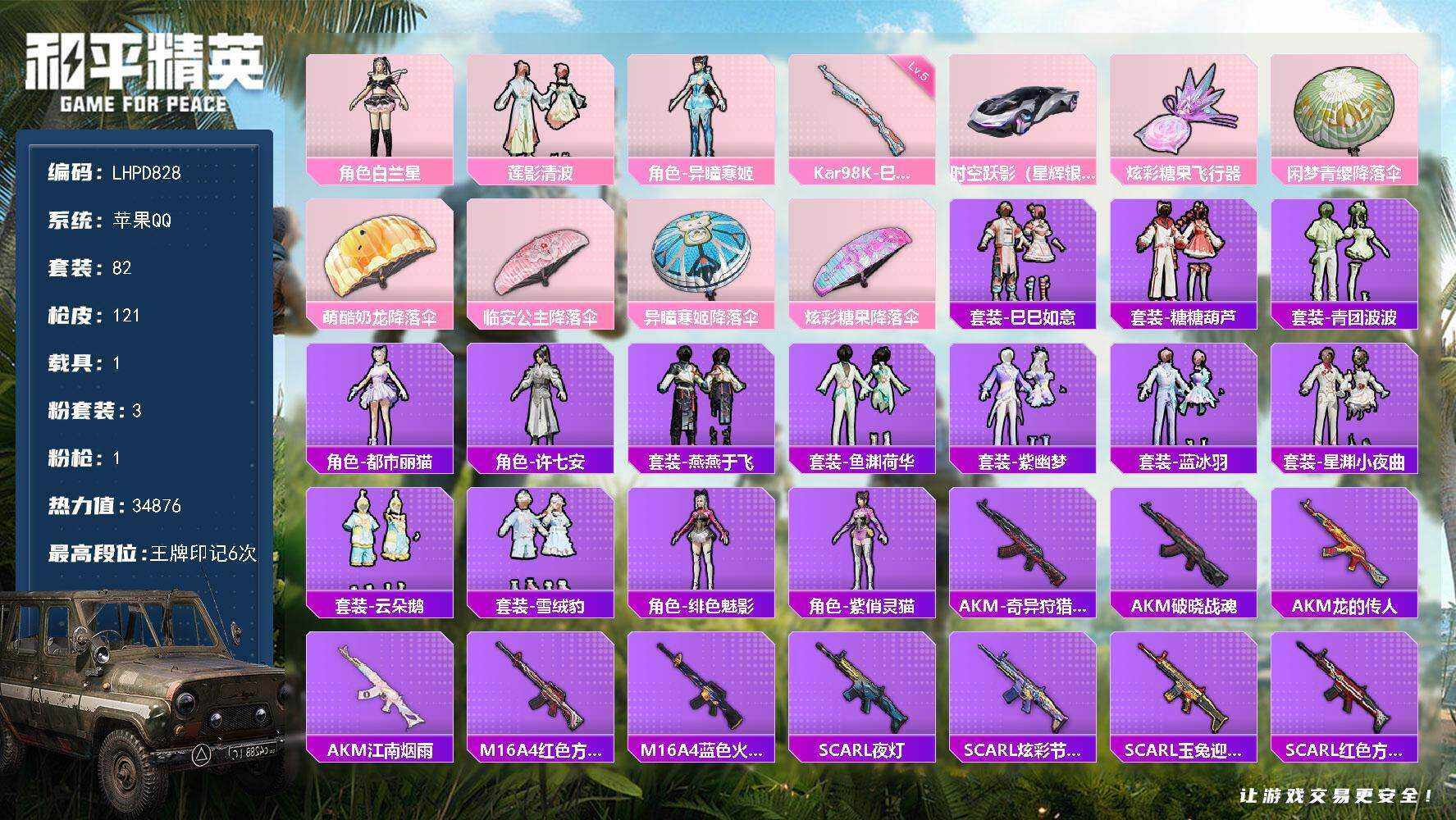 【店主推荐捡漏号!可直接换绑】苹果 手Q-3粉装-1特效枪-1载具-1粉色飞行器-34876热力值-6王牌印记-82套装-121枪皮【粉色套装】:角色-白兰星,粉装-莲影清波,角色-异瞳寒姬【粉色枪皮等级】:Kar98K-巳巳如意(五级)【粉色载具】:时空跃影(星辉银)【粉色枪皮】:Kar98K-巳巳如意【粉色飞行器】:炫彩糖果飞行器