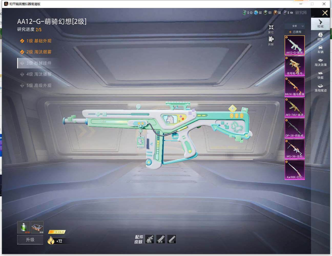 【粉色枪皮等级】:AKS-74U-森灵之息(五级),Kar98K-巳巳如意(五级),Mk14-福马献瑞(五级),AA12-G-萌骑幻想(二级),DP-28-豹影疾电(五级),MG-36-沧焰双生(五级),信号枪-金乌曜日(四级)