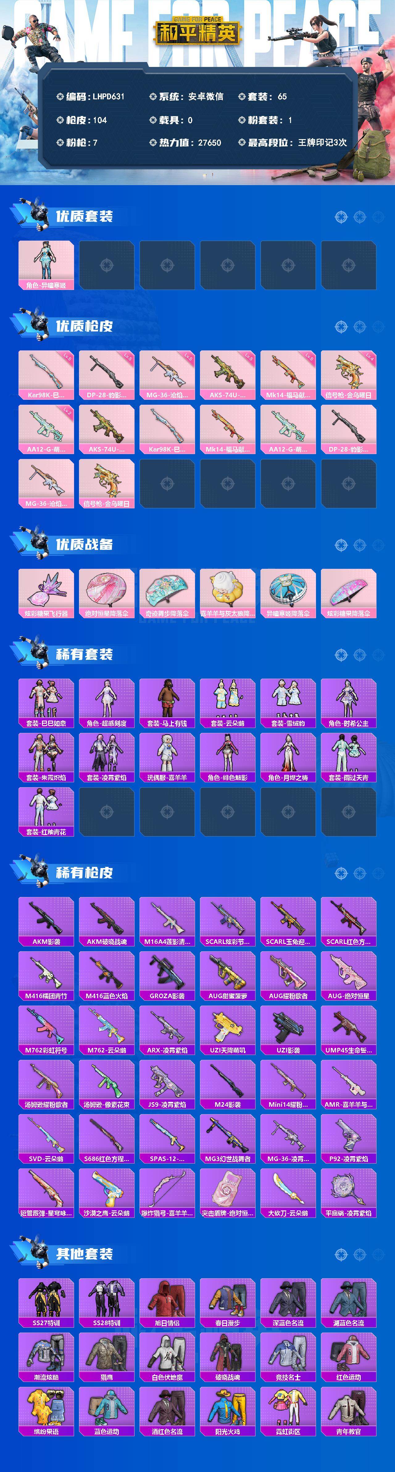 【店主推荐捡漏号!可直接换绑】安卓 微信-1粉装-7特效枪-0载具-1粉色飞行器-27650热力值-3王牌印记-65套装-104枪皮