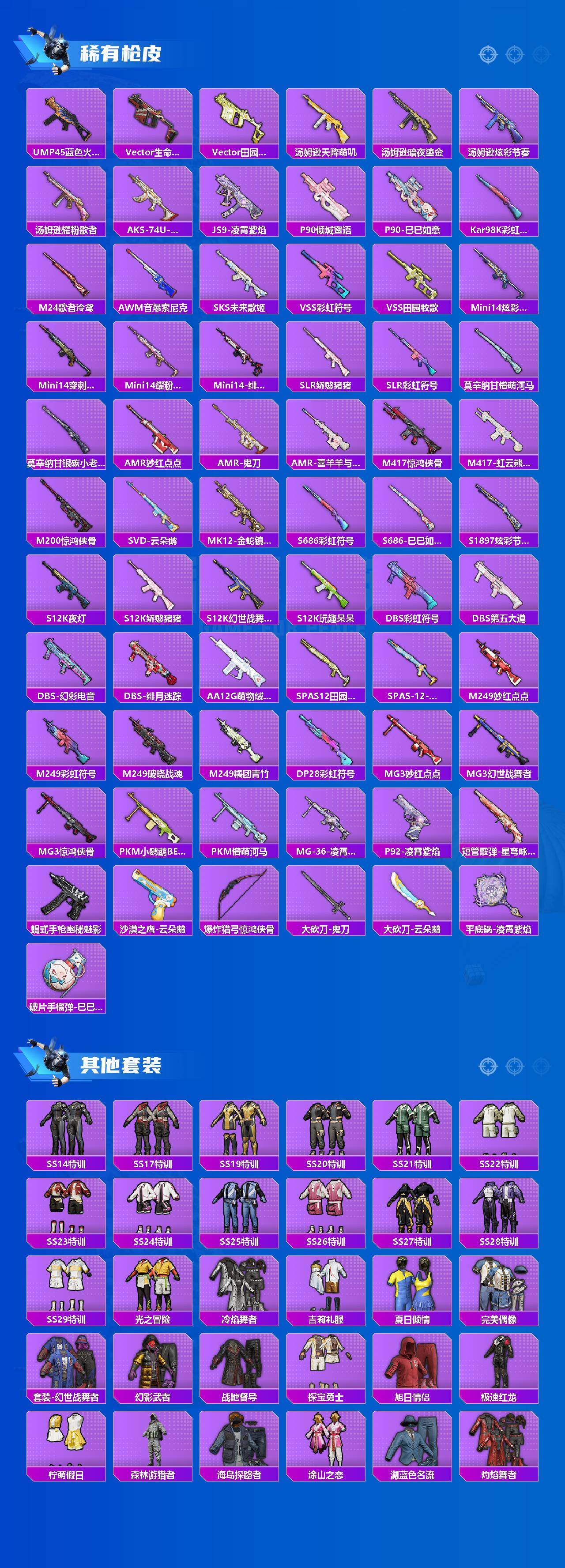【粉色枪皮等级】:SCAR-L-锦绣绵绵(五级),AUG-暖羊咩咩(五级),M762-鬼刀(七级),Kar98K-未来歌姬(五级),Kar98K-巳巳如意(五级),Mk14-甜梦熊击(五级),Mk14-福马献瑞(一级),DP-28-豹影疾