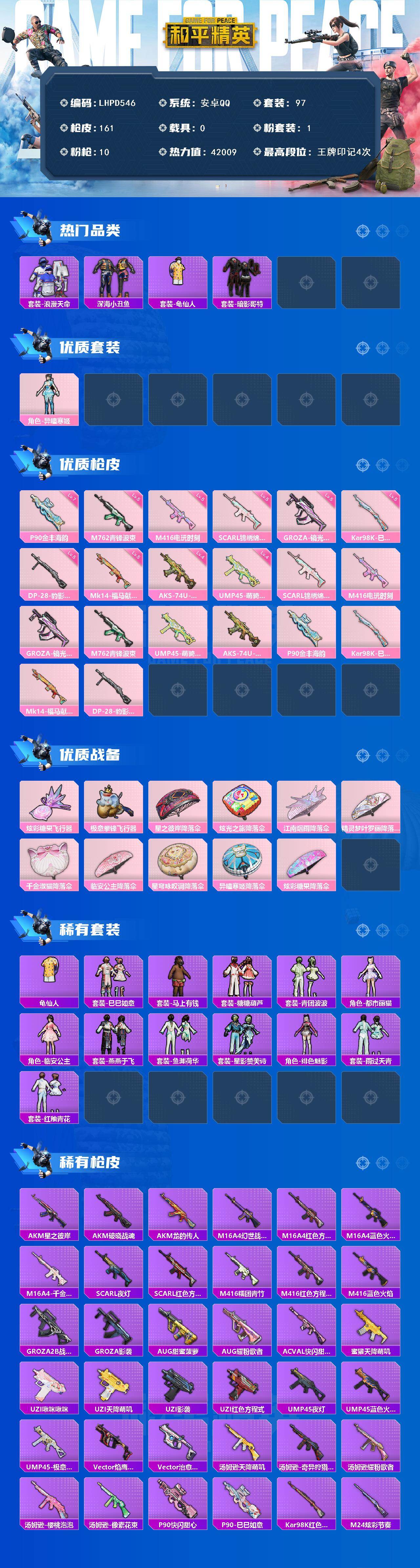 【店主推荐捡漏号!可直接换绑】安卓 手Q-1粉装-10特效枪-0载具-2粉色飞行器-42009热力值-4王牌印记-97套装-161枪皮【热门品类】:套装-浪漫天命,套装-深海小丑鱼,套装-龟仙人,套装-暗影哥特【粉色套装】:角色-异瞳寒姬【粉色枪皮等级】:SCAR-L-锦绣绵绵(五级),M416-电玩时刻(五级),GROZA-镜光银凌(五级),M762-青锋波束(五级),UMP45-萌骑冒险(四级),AKS-74U-森灵之息(四级),P90-金丰海韵(七级),Kar98K-巳巳如意(五级),Mk