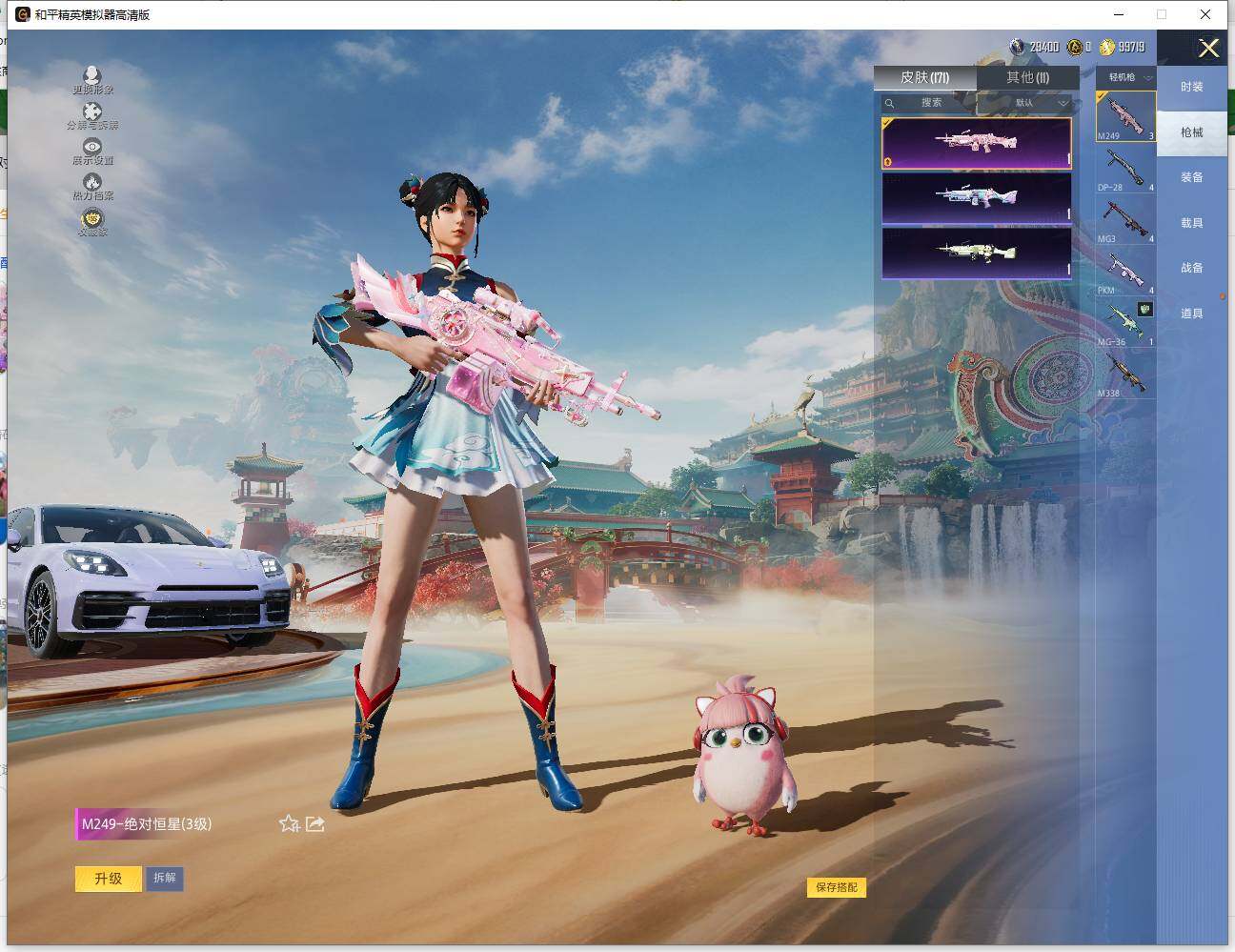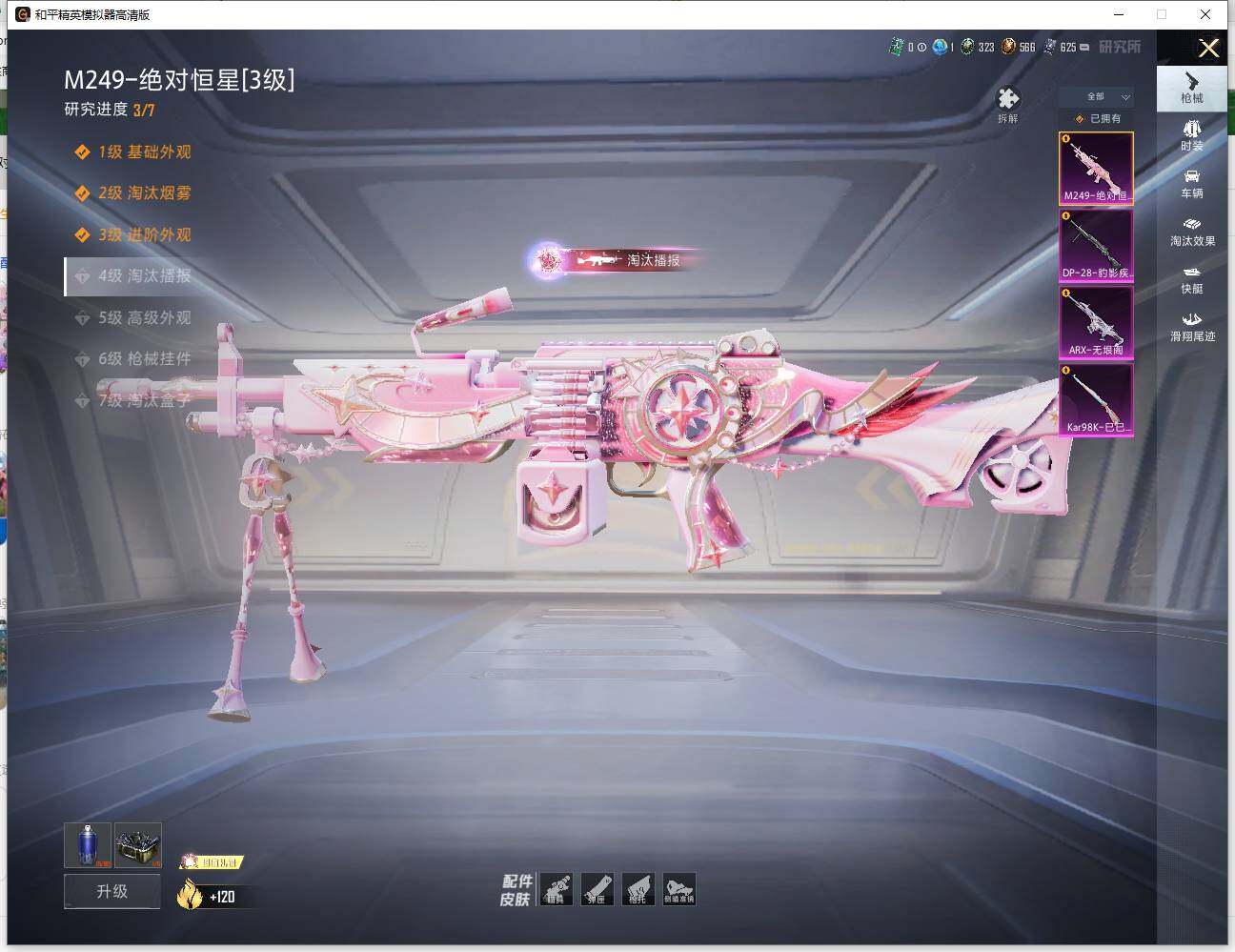 【粉色枪皮等级】:ARX-无垠阁(七级),Kar98K-巳巳如意(五级),M249-绝对恒星(三级),DP-28-豹影疾电(五级)