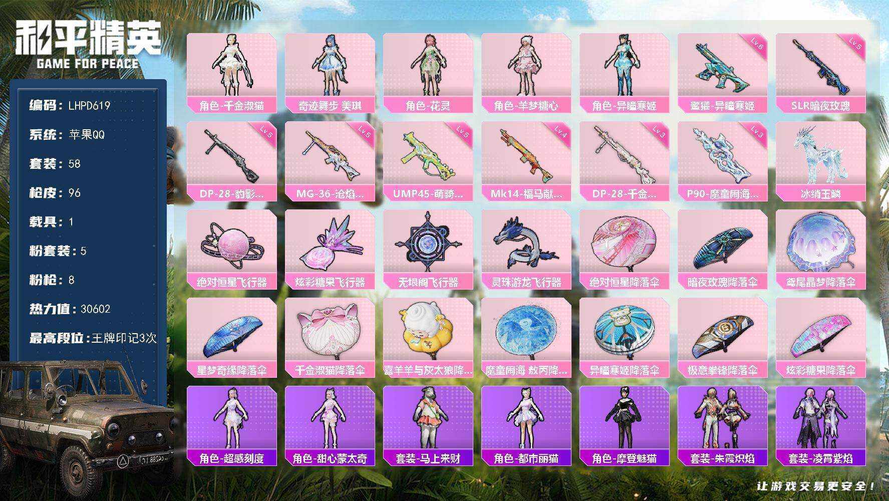 【店主推荐捡漏号!可直接换绑】苹果 手Q-5粉装-8特效枪-1载具-4粉色飞行器-30602热力值-3王牌印记-58套装-96枪皮【粉色套装】:角色-千金淑猫,角色-奇迹舞步 美琪,角色-花灵,角色-羊梦糖心,角色-异瞳寒姬【粉色枪皮等级】:蜜獾-异瞳寒姬(六级),UMP45-萌骑冒险(五级),P90-魔童闹海 敖丙(三级),Mk14-福马献瑞(四级),SLR-暗夜玫瑰(五级),DP-28-千金淑猫(三级),DP-28-豹影疾电(五级),MG-36-沧焰双生(五级)【粉色载具】:冰绡玉鳞【粉色枪