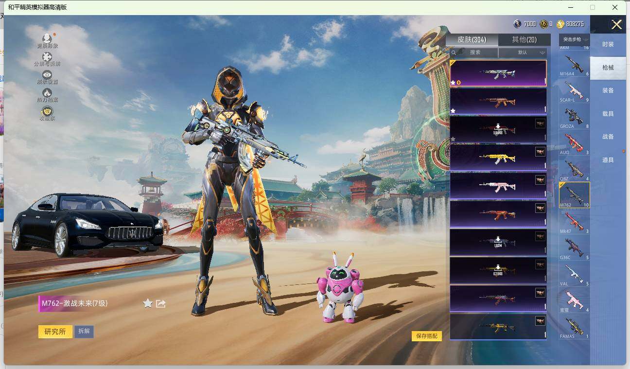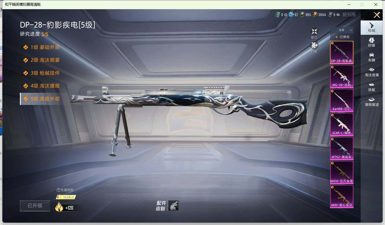 【粉色枪皮等级】:AKM-甜心宝贝(七级),SCAR-L-锦绣绵绵(五级),M416-五爪金龙(七级),M762-激战未来(七级),Kar98K-巳巳如意(五级),DP-28-豹影疾电(五级),