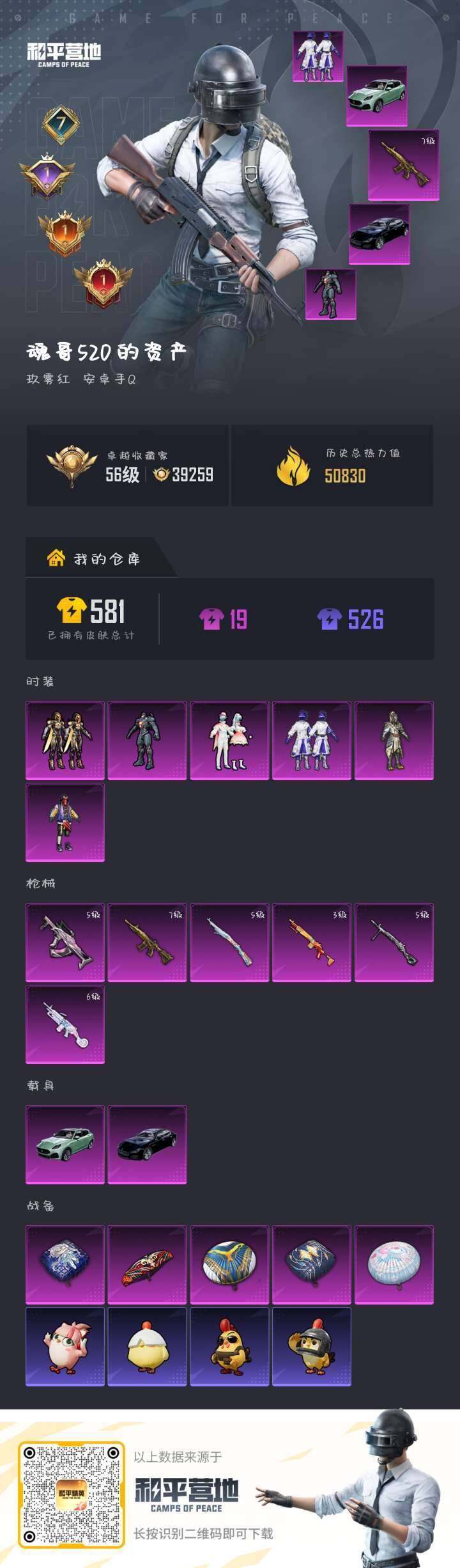【店主推荐捡漏号!可直接换绑】安卓 手Q-6粉装-6特效枪-2载具-0粉色飞行器-50830热力值-7王牌印记-147套装-155枪皮【热门品类】:角色-军刀雅典娜,套装-龟仙人【粉色套装】:粉装-金曜白虎,粉装-天禅智恒,粉装-新星烈龙,角色-复仇流浪者,粉装-旋转彩虹,套装-创世·救赎【粉色枪皮等级】:M416-五爪金龙(七级),GROZA-镜光银凌(五级),Kar98K-巳巳如意(五级),Mk14-福马献瑞(三级),M249-彩虹甜喵(六级),DP-28-豹影疾电(五级)【粉色载具】:玛莎