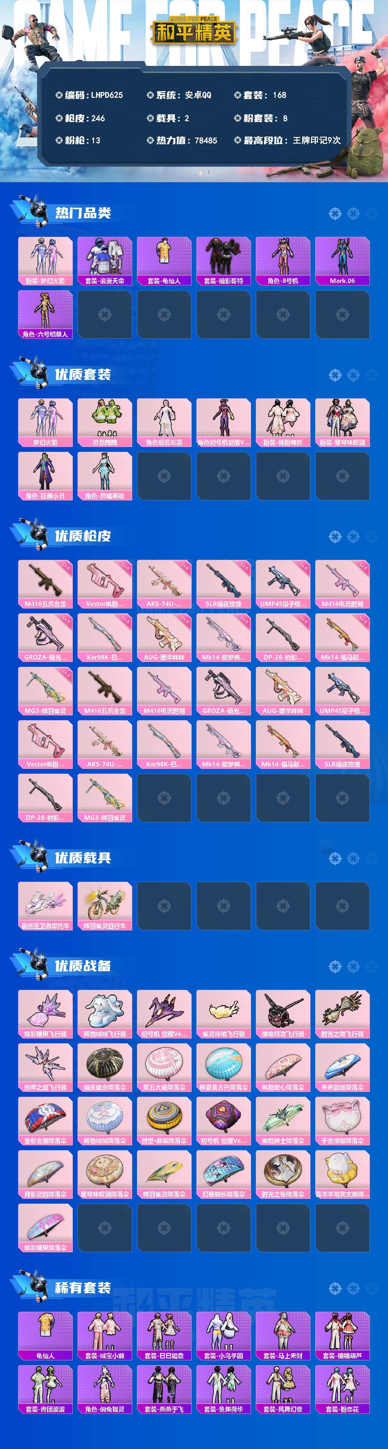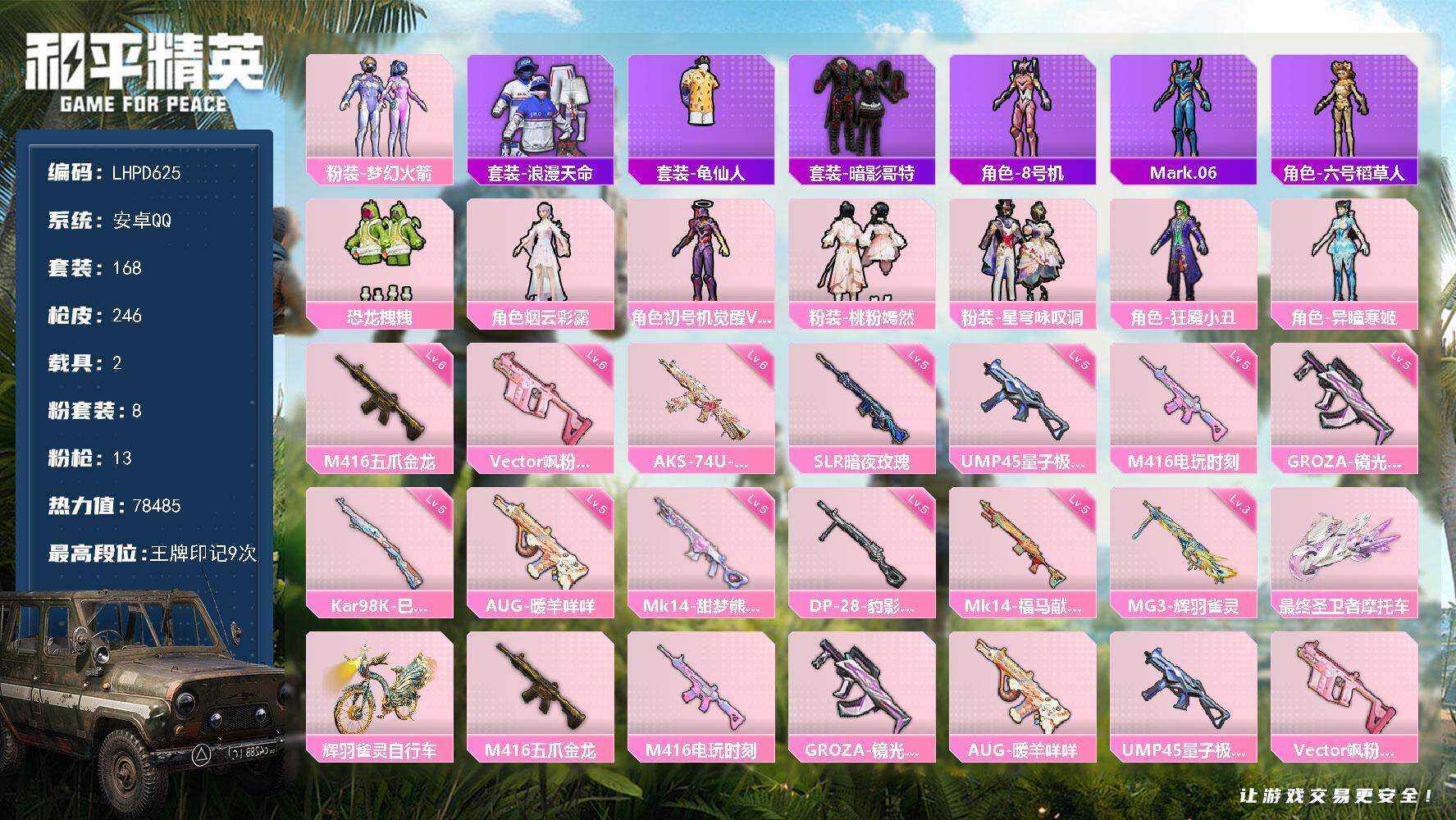 【店主推荐捡漏号!可直接换绑】安卓 手Q-8粉装-13特效枪-2载具-8粉色飞行器-78485热力值-9王牌印记-168套装-246枪皮【热门品类】:粉装-梦幻火箭,套装-浪漫天命,套装-龟仙人,套装-暗影哥特,角色-8号机,角色-Mark.06,角色-六号稻草人【粉色套装】:粉装-梦幻火箭,粉装-恐龙拽拽,角色-烟云彩露,角色-初号机 觉醒Ver.,粉装-桃粉嫣然,粉装-星穹咏叹调,角色-狂魇小丑,角色-异瞳寒姬【粉色枪皮等级】:M416-五爪金龙(六级),M416-电玩时刻(五级),GROZ