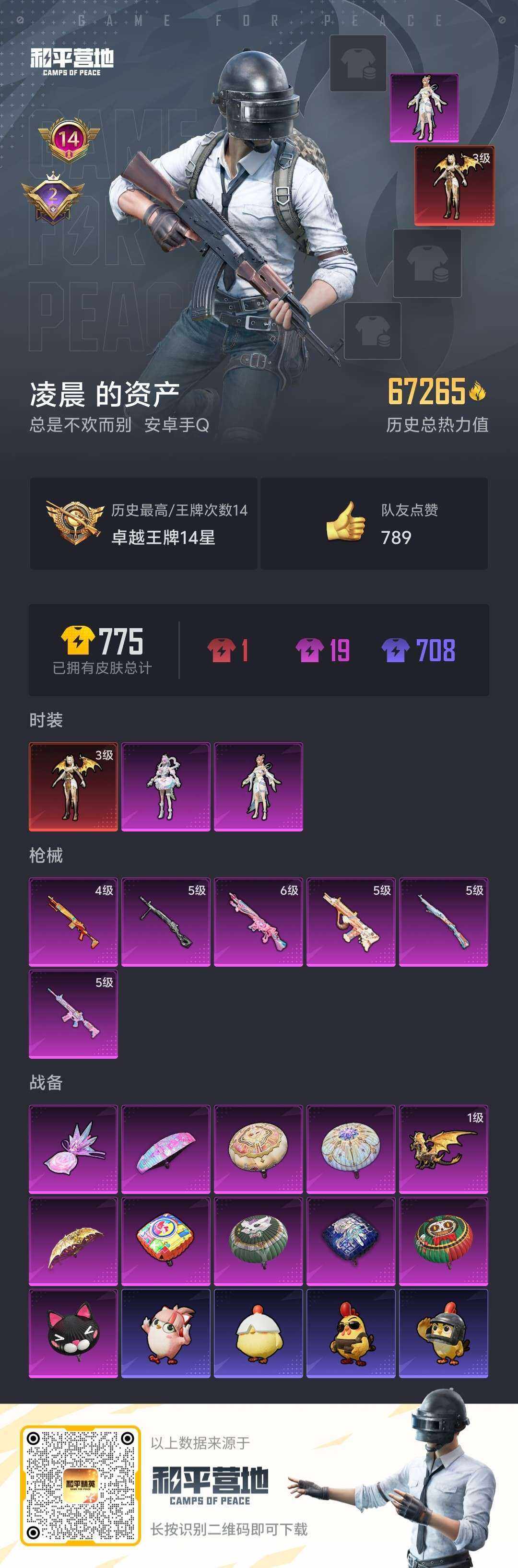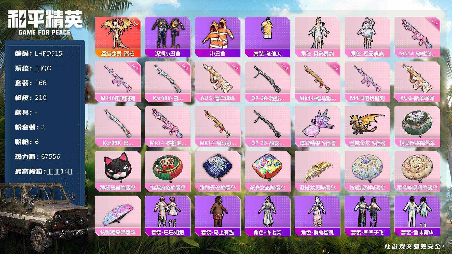 【店主推荐捡漏号!可直接换绑】安卓 手Q-1神装-2粉装-6特效枪-0载具-2粉色飞行器-67556热力值-14王牌印记-166套装-210枪皮【红色神装等级】:圣域龙灵-瑞拉(三级)【红色角色神装】:圣域龙灵-瑞拉【热门品类】:套装-深海小丑鱼,套装-小丑鱼,套装-龟仙人【粉色套装】:角色-月影灵韵,角色-虹云熊熊【粉色枪皮等级】:M416-电玩时刻(五级),AUG-暖羊咩咩(五级),Kar98K-巳巳如意(五级),Mk14-樱桃泡泡(六级),Mk14-福马献瑞(四级),DP-28-豹影疾电(
