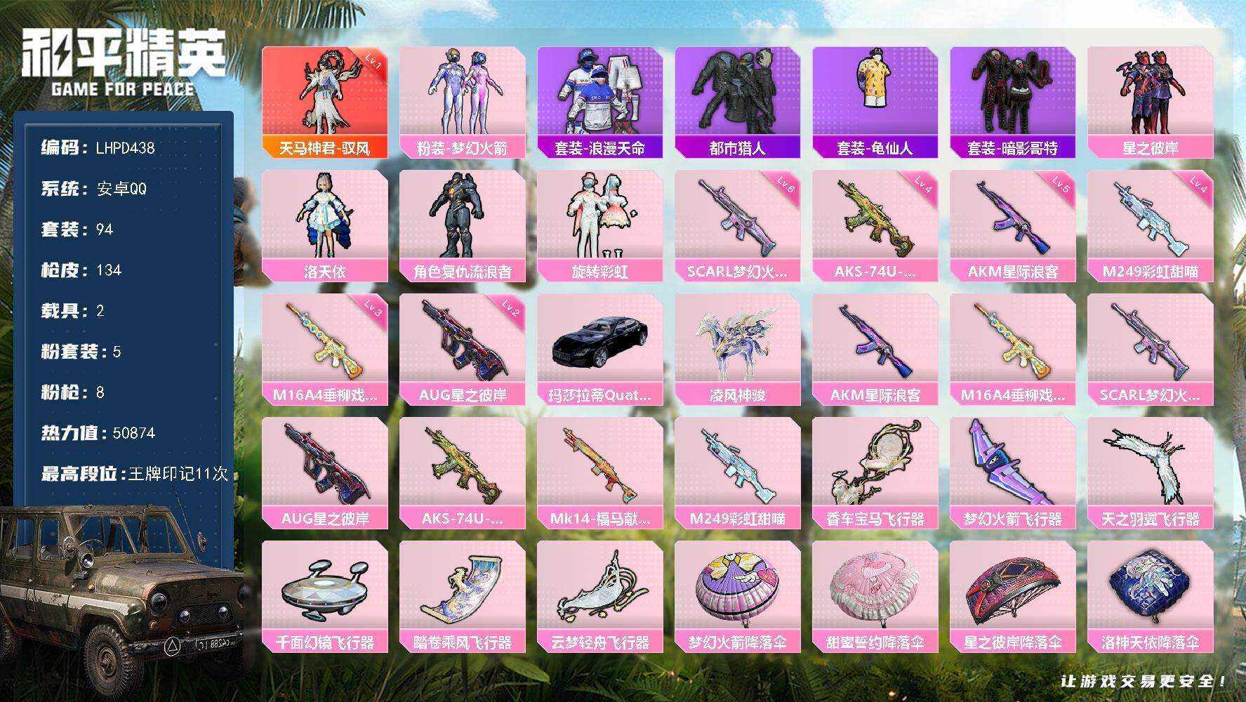 【店主推荐捡漏号!可直接换绑】安卓 手Q-1神装-5粉装-8特效枪-2载具-7粉色飞行器-50874热力值-11王牌印记-94套装-134枪皮【红色神装等级】:天马神君-驭风(一级)【红色角色神装】:天马神君-驭风【热门品类】:粉装-梦幻火箭,套装-浪漫天命,套装-都市猎人,套装-龟仙人,套装-暗影哥特【粉色套装】:粉装-梦幻火箭,粉装-星之彼岸,角色-洛天依,角色-复仇流浪者,粉装-旋转彩虹【粉色枪皮等级】:AKM-星际浪客(五级),M16A4-垂柳戏鸭(三级),SCAR-L-梦幻火箭(六级)