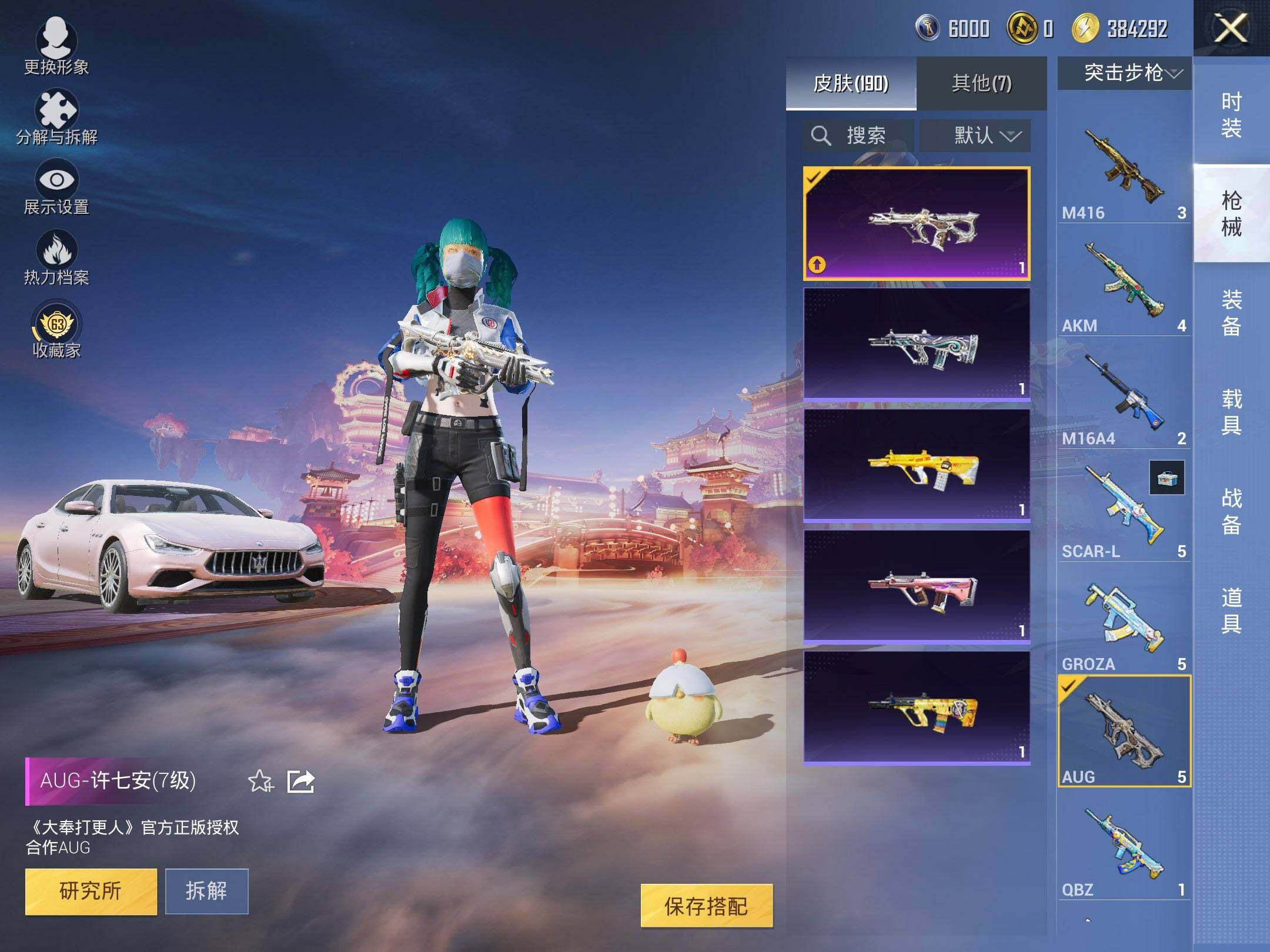 【粉色枪皮等级】:AKM-绿萝繁花(五级),M416-五爪金龙(七级),AUG-许