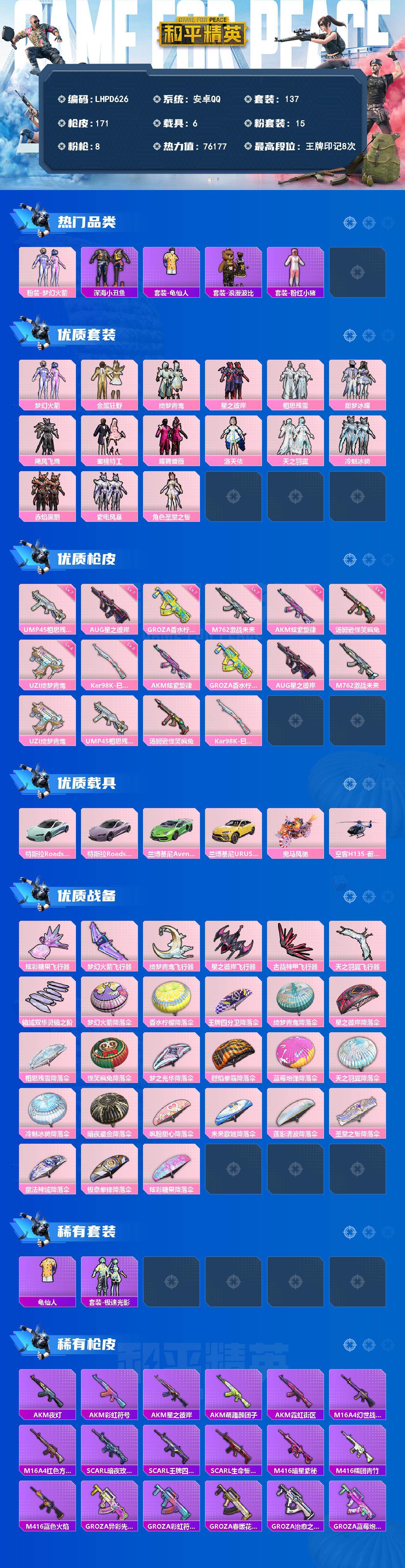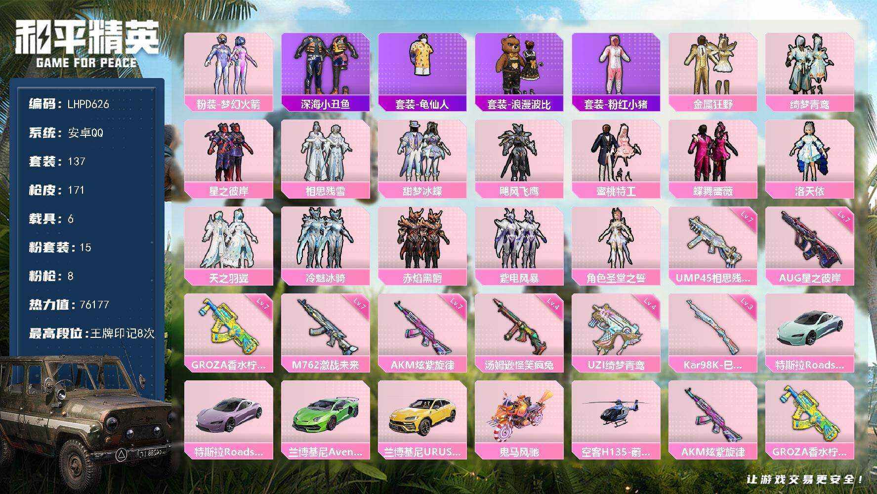 【店主推荐捡漏号!可直接换绑】安卓 手Q-15粉装-8特效枪-6载具-7粉色飞行器-76177热力值-8王牌印记-137套装-171枪皮【热门品类】:粉装-梦幻火箭,套装-深海小丑鱼,套装-龟仙人,套装-浪漫波比,套装-粉红小猪【粉色套装】:粉装-梦幻火箭,粉装-金属狂野,粉装-绮梦青鸾,粉装-星之彼岸,粉装-相思残雪,粉装-甜梦冰蝶,粉装-飓风飞鹰,粉装-蜜桃特工,粉装-蝶舞蔷薇,角色-洛天依,粉装-天之羽翼,粉装-冷魅冰骑,粉装-赤焰黑爵,粉装-紫电风暴,角色-圣堂之誓【粉色枪皮等级】:AK