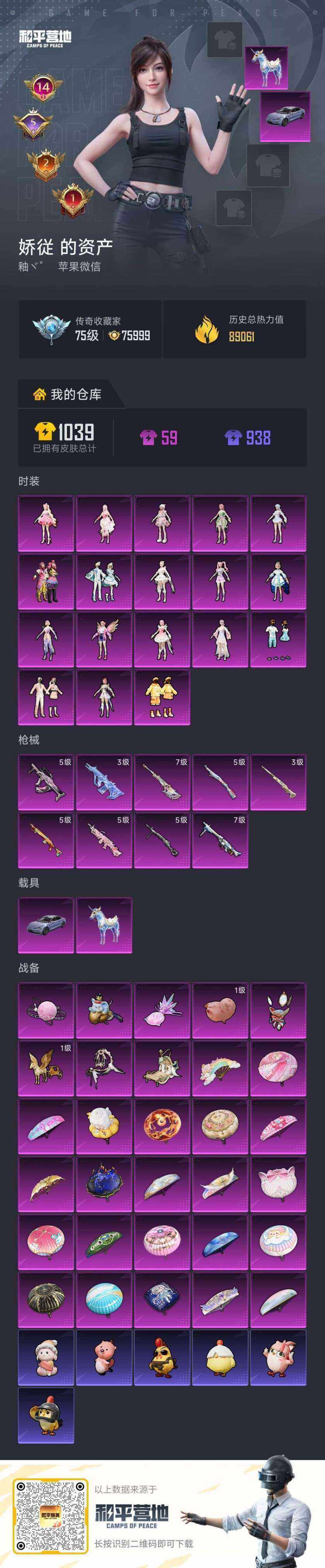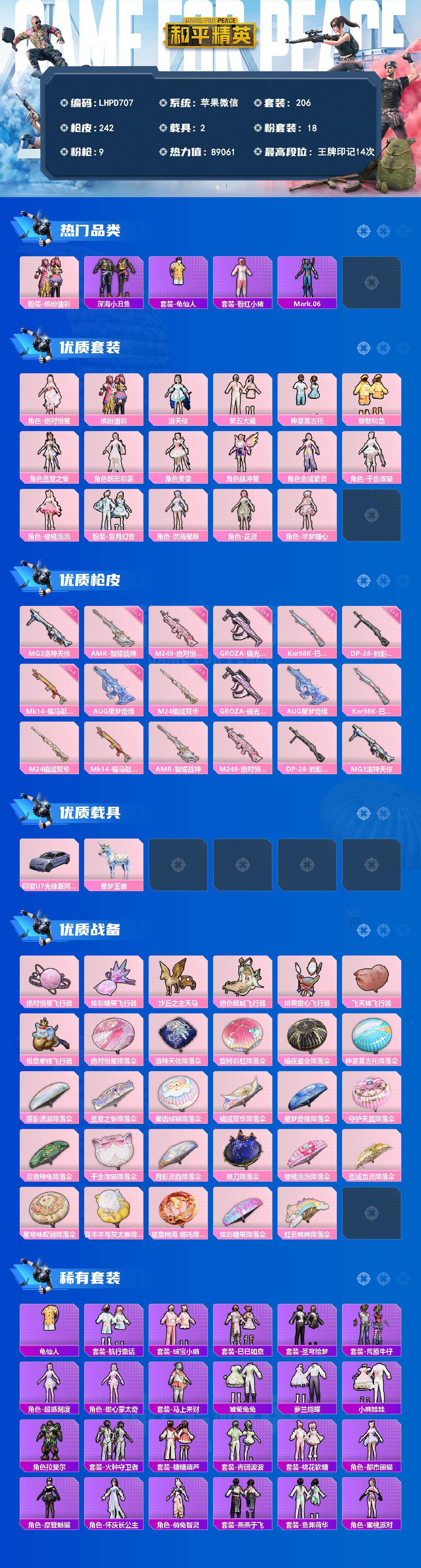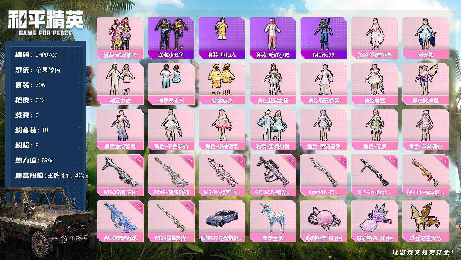【店主推荐捡漏号!可直接换绑】苹果 微信-18粉装-9特效枪-2载具-8粉色飞行器-89061热力值-14王牌印记-206套装-242枪皮【热门品类】:粉装-缤纷油彩,套装-深海小丑鱼,套装-龟仙人,套装-粉红小猪,角色-Mark.06【粉色套装】:角色-绝对恒星,粉装-缤纷油彩,角色-洛天依,粉装-第五大道,粉装-仲夏莫吉托,粉装-憨憨奶龙,角色-圣堂之誓,角色-烟云彩露,角色-美雪,角色-脉冲星,角色-金域紫灵,角色-千金淑猫,角色-樱桃泡泡,粉装-雪月幻音,角色-荧海星豚,角色-花灵,角色