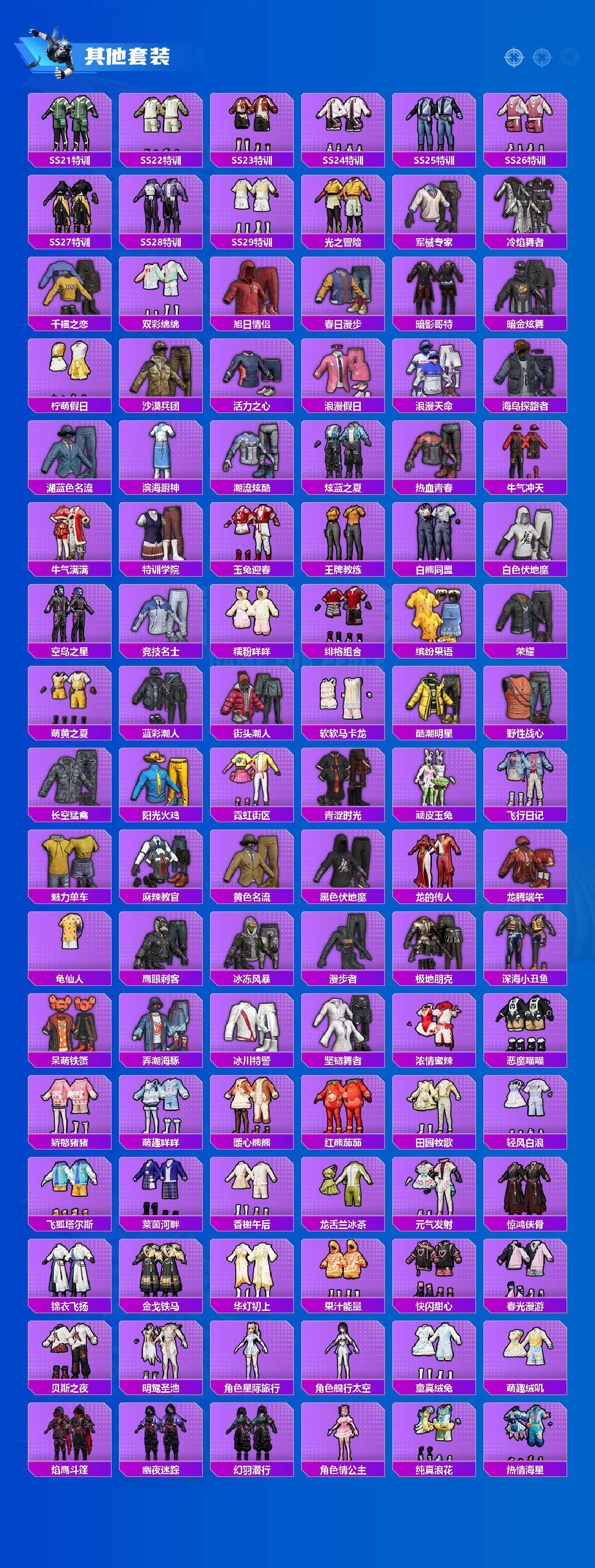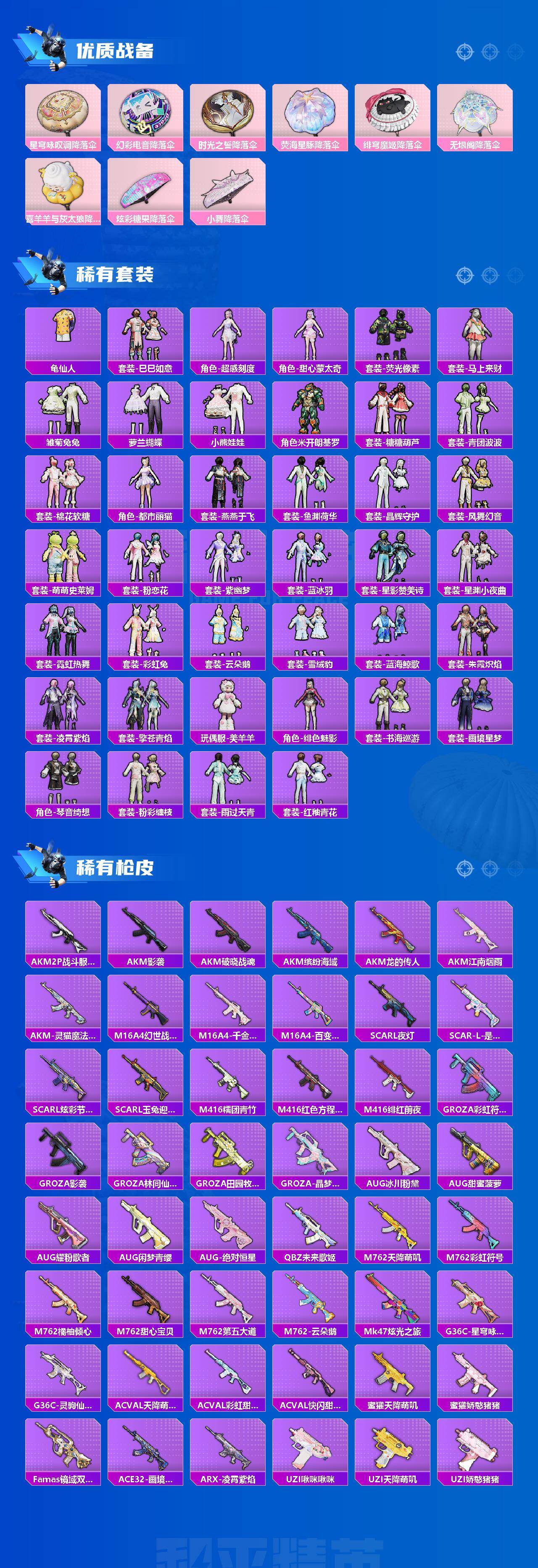【粉色套装】:角色-绝对恒星,粉装-天使彩虹糖,粉装-缤纷油彩,粉装-山涧鹿灵,粉装-彩虹甜喵,粉装-第五大道,角色-小可学妹,粉装-未来歌姬,粉装-蜜语绒猫,角色-