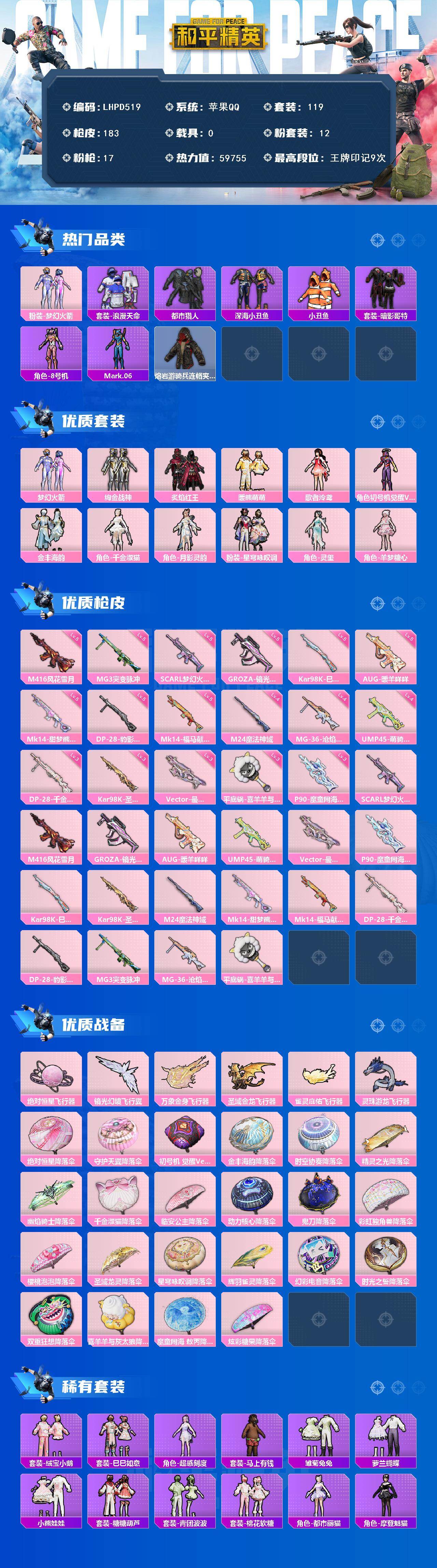 【店主推荐捡漏号!可直接换绑】苹果 手Q-12粉装-17特效枪-0载具-6粉色飞行器-59755热力值-9王牌印记-119套装-183枪皮【热门品类】:粉装-梦幻火箭,套装-浪漫天命,套装-都市猎人,套装-深海小丑鱼,套装-小丑鱼,套装-暗影哥特,角色-8号机,角色-Mark.06,熔岩游骑兵连帽夹克【粉色套装】:粉装-梦幻火箭,粉装-绚金战神,粉装-炙焰红王,粉装-暖熊萌萌,角色-歌者泠鸢,角色-初号机 觉醒Ver.,粉装-金丰海韵,角色-千金淑猫,角色-月影灵韵,粉装-星穹咏叹调,角色-灵玺