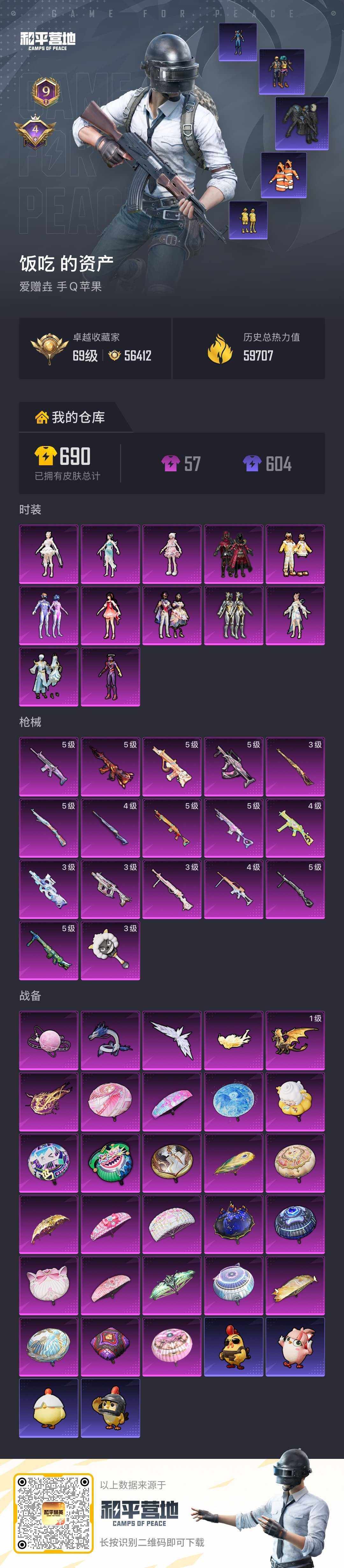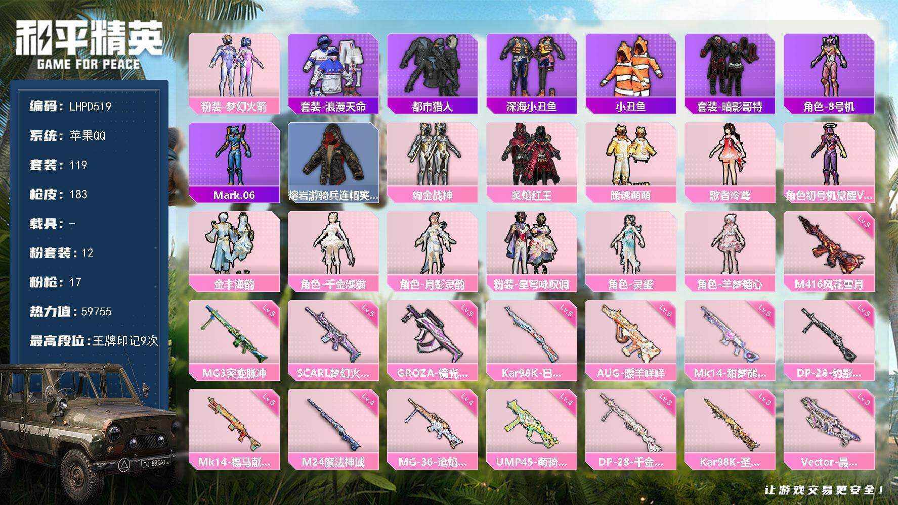 12粉装-17特效枪-0载具-6粉色飞行器-59755热力值-9王牌印记-119套装-183枪皮