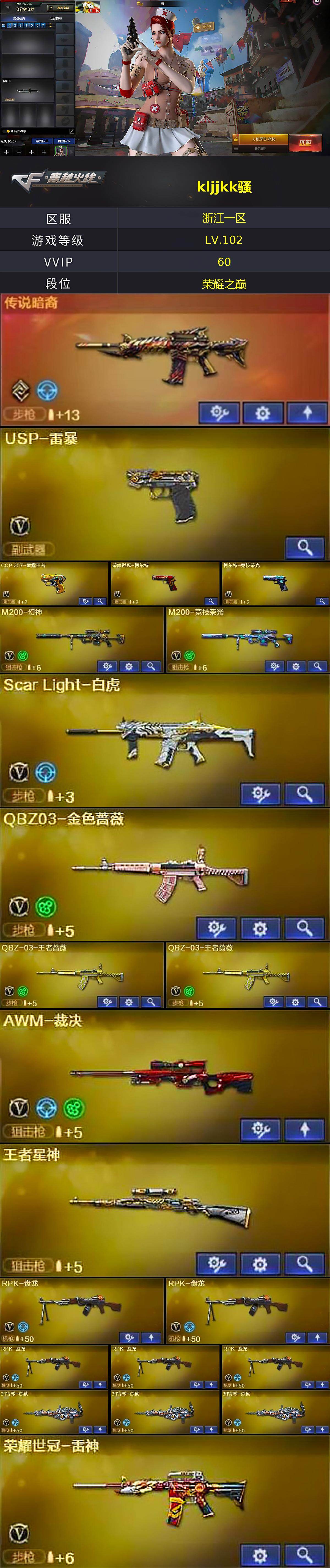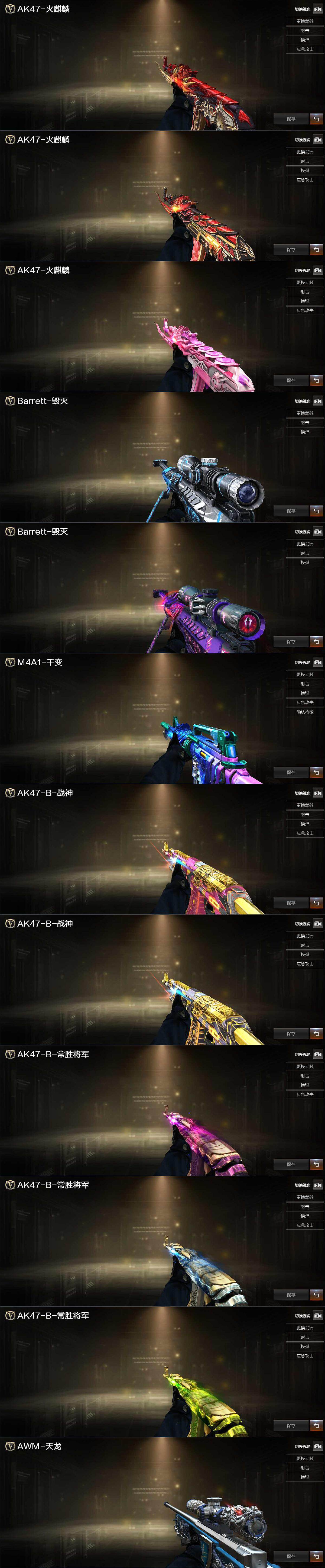 【热门武器】:传说暗裔,王者星神,QBZ03-金色蔷薇,Scar Light-白虎,HK417-朱雀,M200-幻神,M200-竞技荣光,死亡之眼,荣耀世冠-雷神,荣耀世冠-柯尔特,RPK-盘龙*5,加特林-炼狱*3,USP-雷暴,荣耀世冠-龙啸