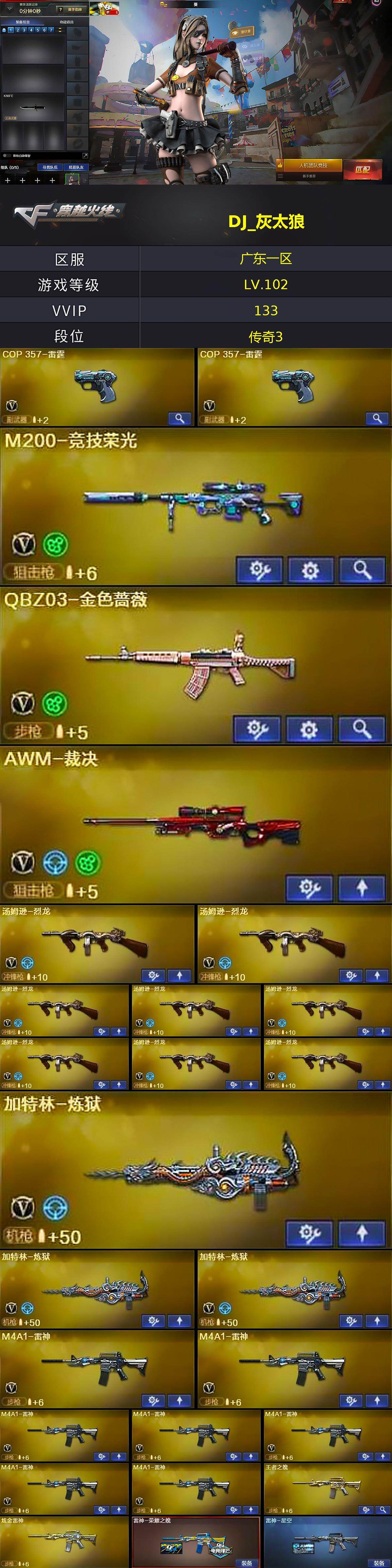 【热门武器】:QBZ03-金色蔷薇,M200-竞技荣光,死亡之眼*6,M4A1-黑骑士,汤姆逊-烈龙*8,加特林-炼狱*3,沙鹰-修罗*8