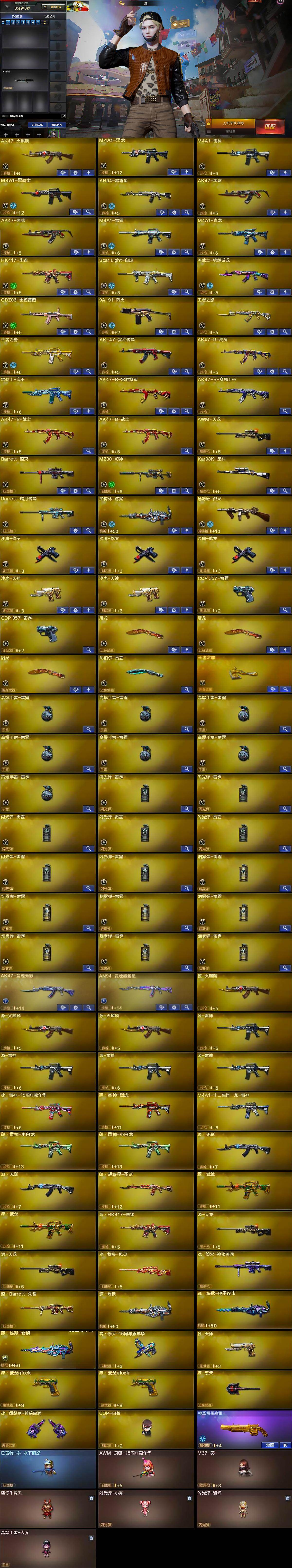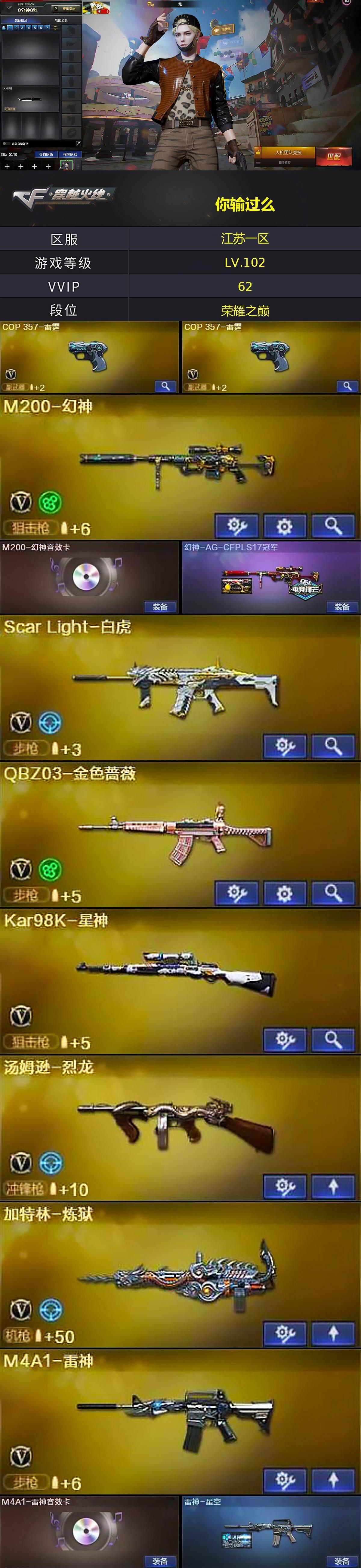 【热门武器】:QBZ03-金色蔷薇,Scar Light-白虎,HK417-朱雀,M4A1-青龙,M200-幻神,Kar98K-星神,金色小号,M4A1-黑骑士,汤姆逊-烈龙,加特林-炼狱,COP-白鲨,沙鹰-修罗*3