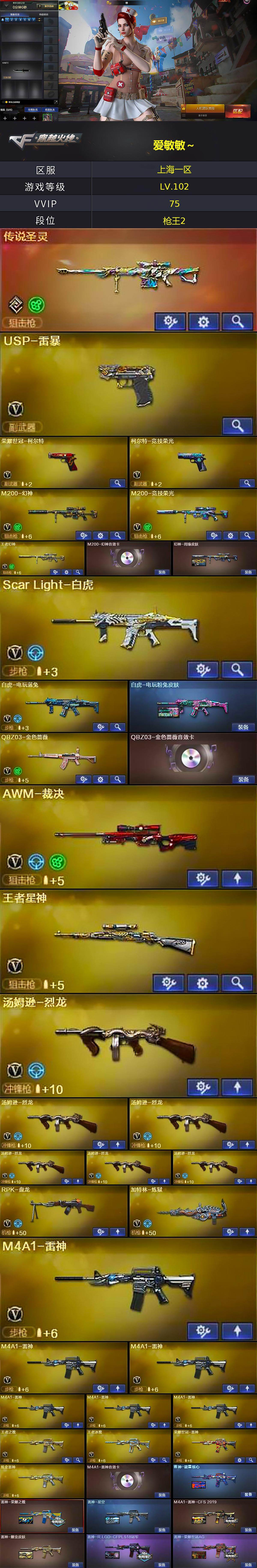 【热门武器】:传说圣灵,QBZ03-金色蔷薇,M14EBR-玄武,Scar Light-白虎,M4A1-青龙,M200-幻神,M200-竞技荣光,死亡之眼,荣耀世冠-雷神,白虎-电玩蓝兔,荣耀世冠-柯尔特,M4A1-黑骑士,汤姆逊-烈龙*6,RPK-盘龙,加特林-炼狱,USP-雷暴,沙鹰-修罗*3,黄金猫猫手套-白鲨,金刚伞