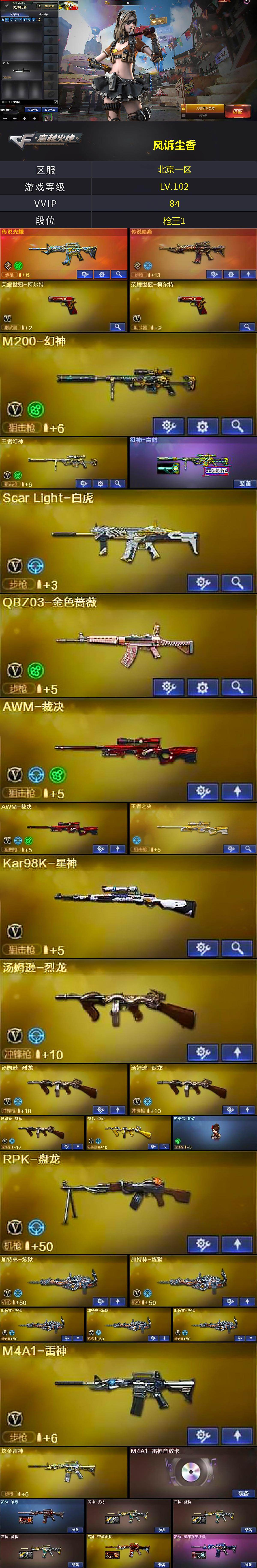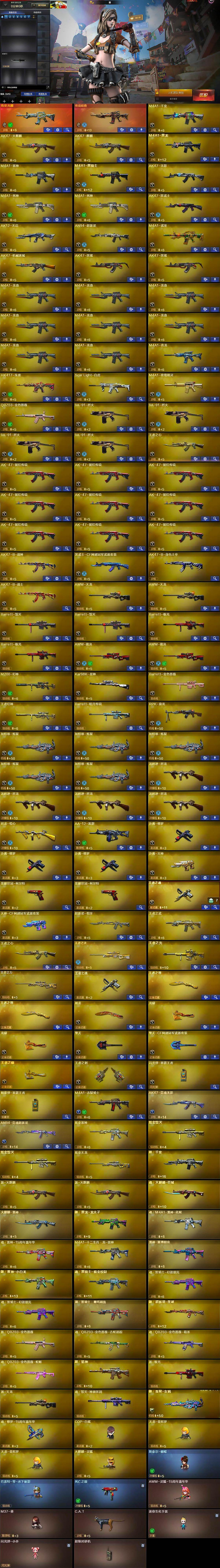【热门武器】:传说光耀,传说暗裔,QBZ03-金色蔷薇,Scar Light-白虎,HK417-朱雀,M4A1-青龙,M200-幻神,死亡之眼,荣耀世冠-柯尔特*2,Kar98K-星神,金色小号,C.A.T,M4A1-黑骑士,汤姆逊-烈龙*4,RPK-盘龙,加特林-炼狱*5,斯泰尔-蝴蝶,羊驼玩偶,COP-白鲨,沙鹰-修罗*3