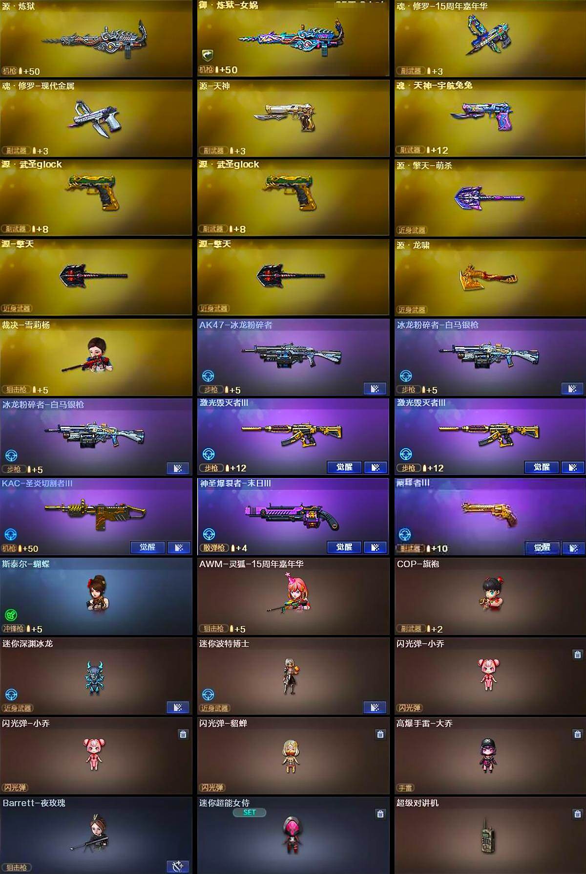 【热门武器】:QBZ03-金色蔷薇,HK417-朱雀,M200-幻神,M200-竞技荣光,荣耀世冠-火麒麟,荣耀世冠-雷神,白虎-电玩蓝兔,荣耀世冠-柯尔特,M4A1-黑骑士,汤姆逊-烈龙,RPK-盘龙*2,加特林-炼狱*2,斯泰尔-蝴蝶,裁决-雪莉杨,USP-雷暴*2,沙鹰-修罗,荣耀世冠-龙啸
