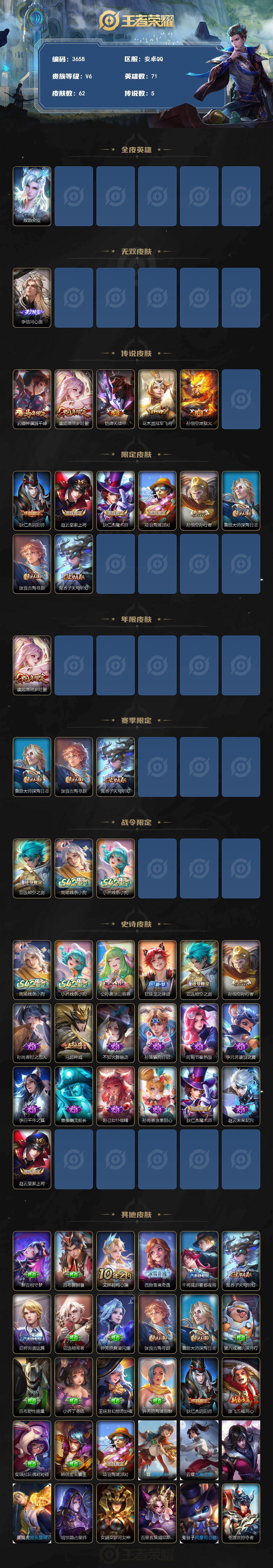 安卓Q-V6-尊贵铂金III段位-71英雄-62皮肤-1无双-5传说-18史诗