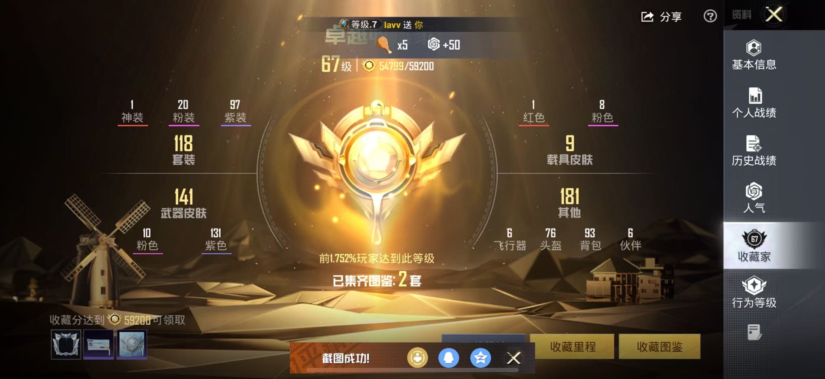1神装-20粉装-10特效枪-1僚机-8载具-5粉色飞行器-70277热力值-5王牌印记-118套装-153枪皮