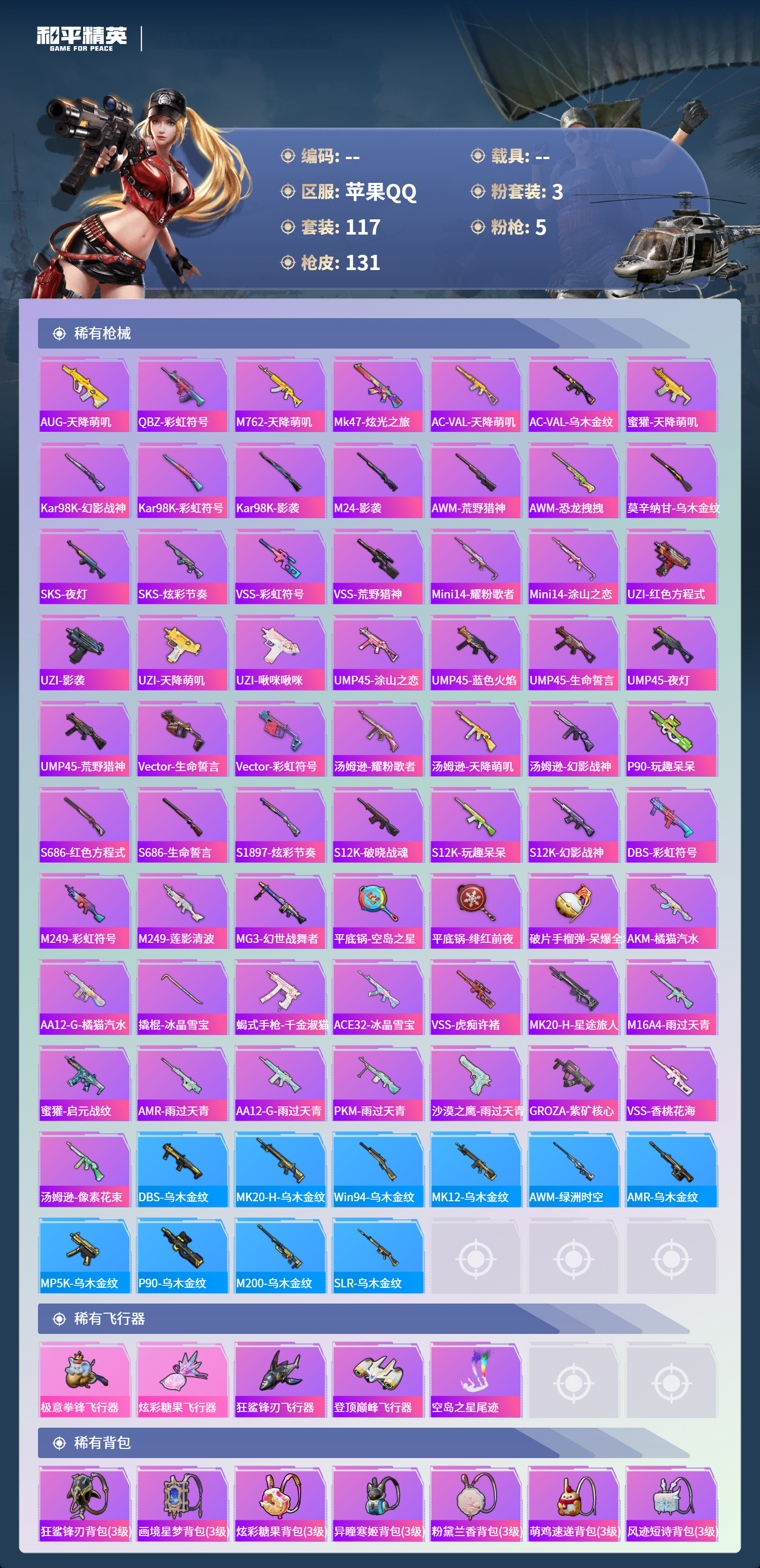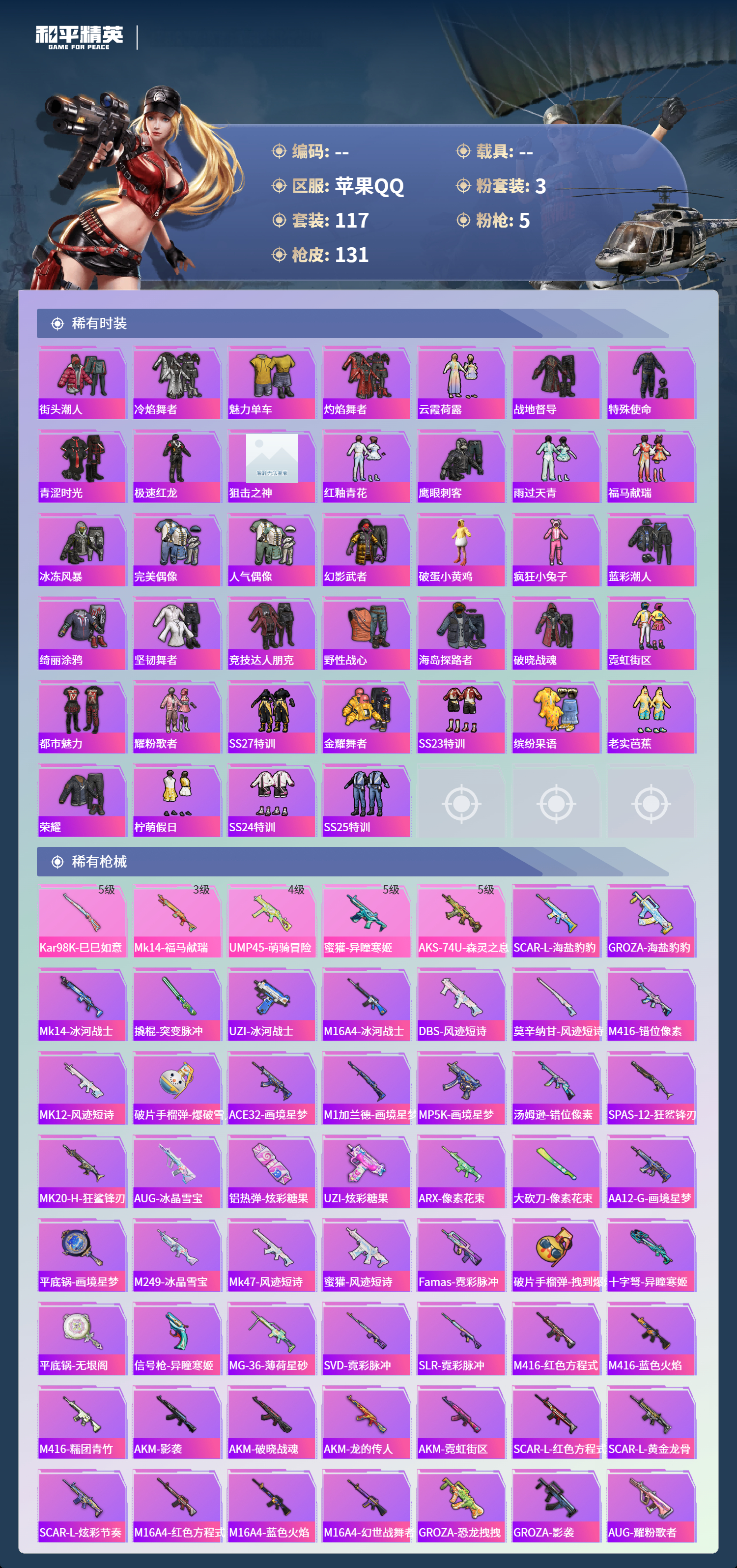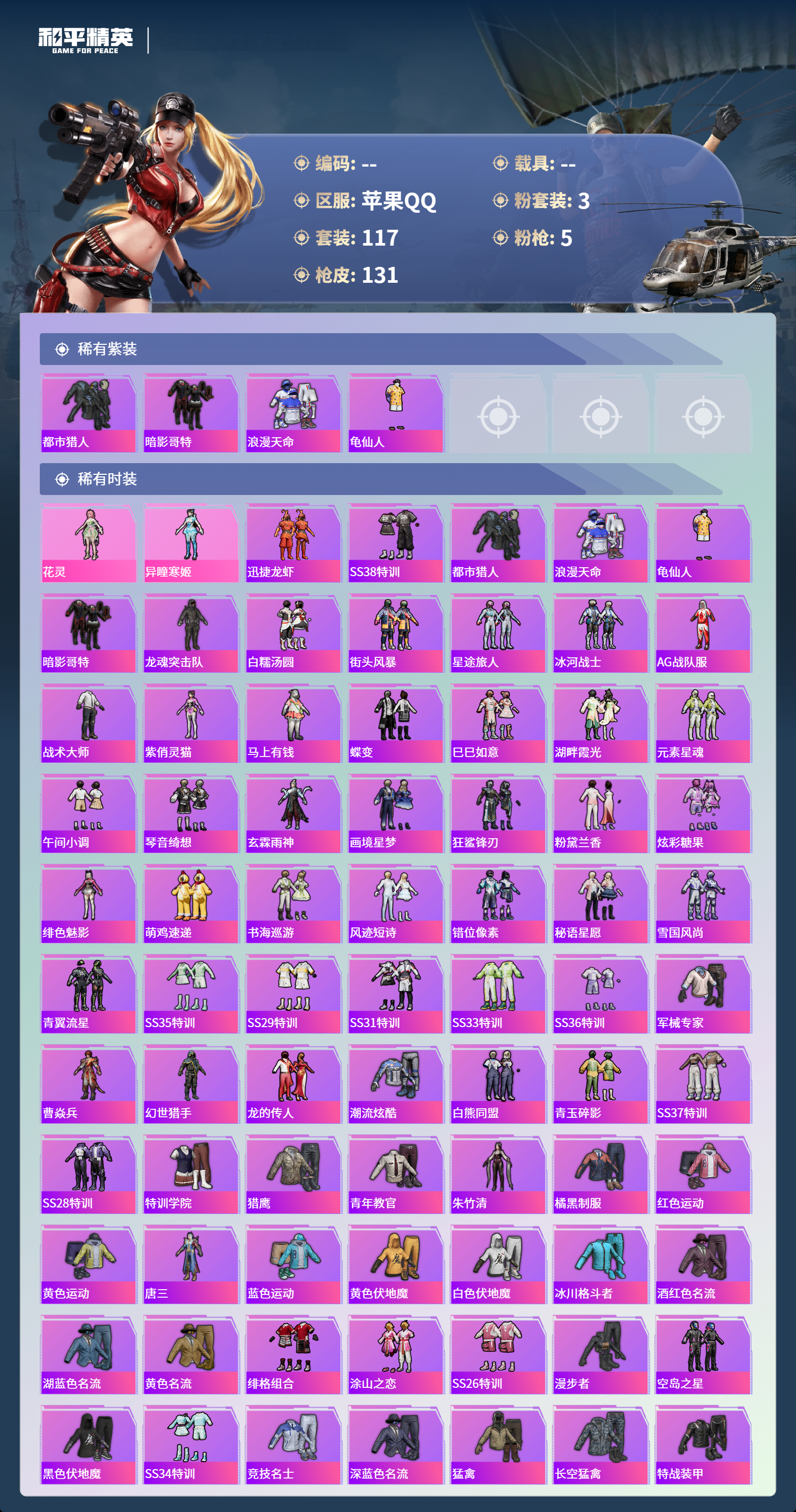 hs68010苹果手Q-2王牌印记-3粉装-5特效枪-34903热力值-117套装-131枪皮-1卓越印记-1传奇印记