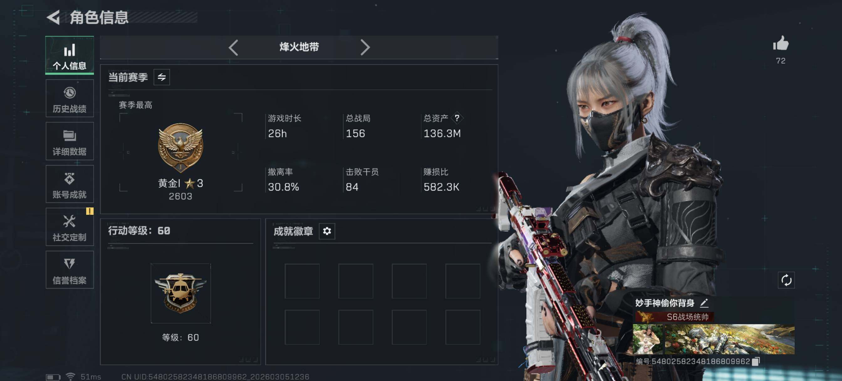 136m总资产-10729k哈伏币-60烽火等级-黄金-50战场等级-校官