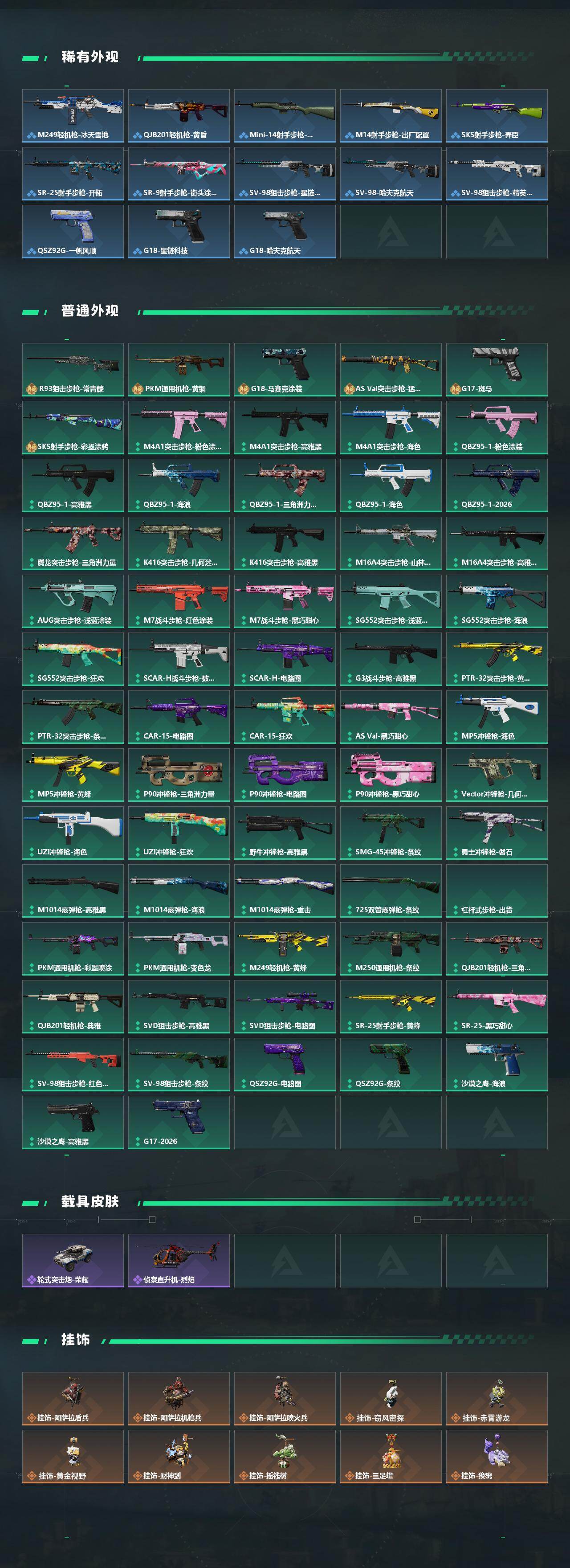 近战-处刑者1级/近战-黑鹰/M4A1突击步枪-蚀金玫瑰/M4A1突击步枪-阿米娅/ASh-12战斗步枪-鹅鸭杀/AUG突击步枪-悠然茶歇/AK-12突击步枪-特斯拉线圈/SCAR-H战斗步枪-启航/G3战斗步枪-骑士/CAR-15突击步枪-阿米娅/腾龙突击步枪-捞点薯条/腾龙突击步枪-马年祥瑞/腾龙突击步枪-万金泪冠/KC17突击步枪-电锯惊魂/MK47突击步枪-悠然茶歇/UZI冲锋枪-特斯拉线