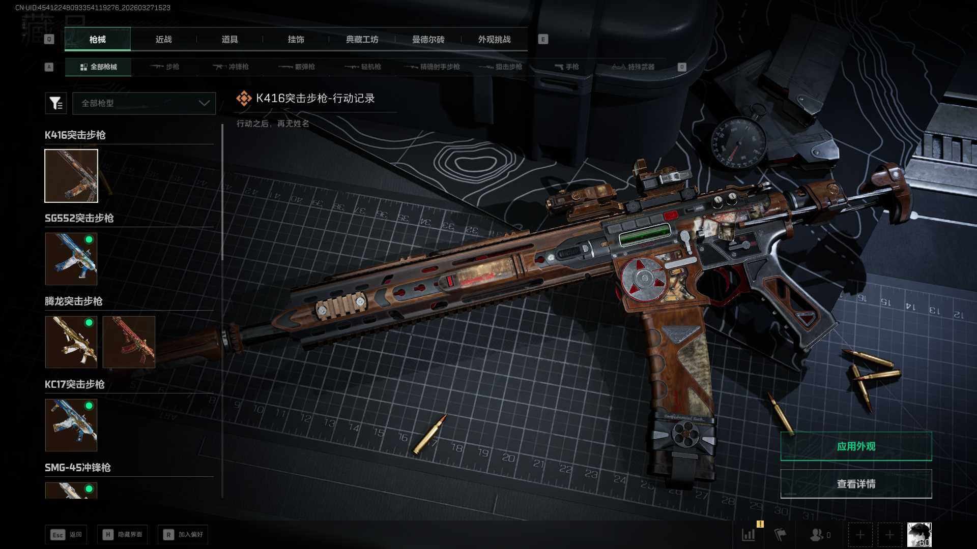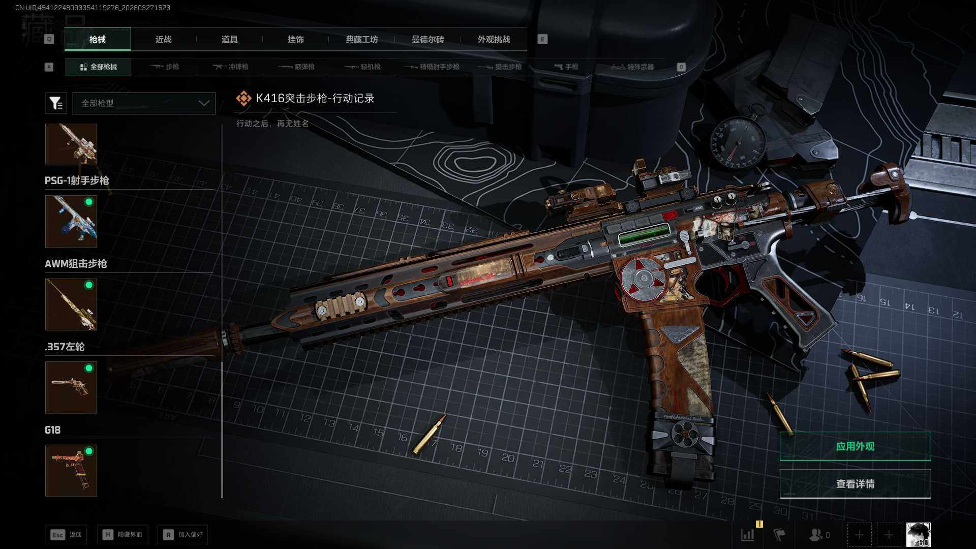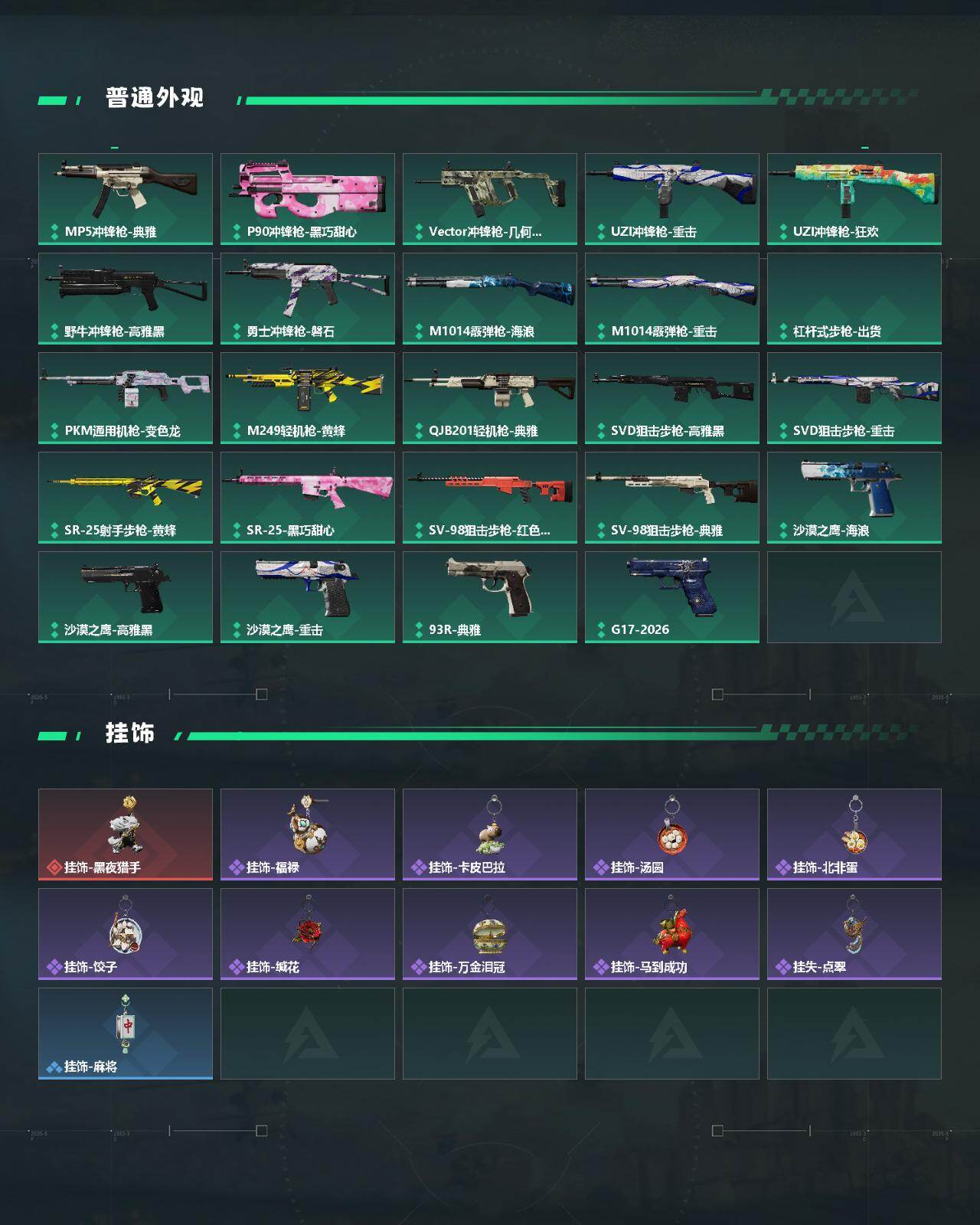 K416突击步枪-行动记录/SG552突击步枪-点翠/腾龙突击步枪-马年祥瑞/腾龙突击步枪-万金泪冠/KC17突击步枪-点翠/SMG-45冲锋枪-锦绣/勇士冲锋枪-万金泪冠/M14射手步枪-蛮荒/M14射手步枪-缄花/SKS射手步枪-骑士/SR-25射手步枪-缄花/PSG-1射手步枪-点翠/AWM狙击步枪-万金泪冠/.357左轮-缄花/G18-马年祥瑞/K416突击步枪-冬日风情/