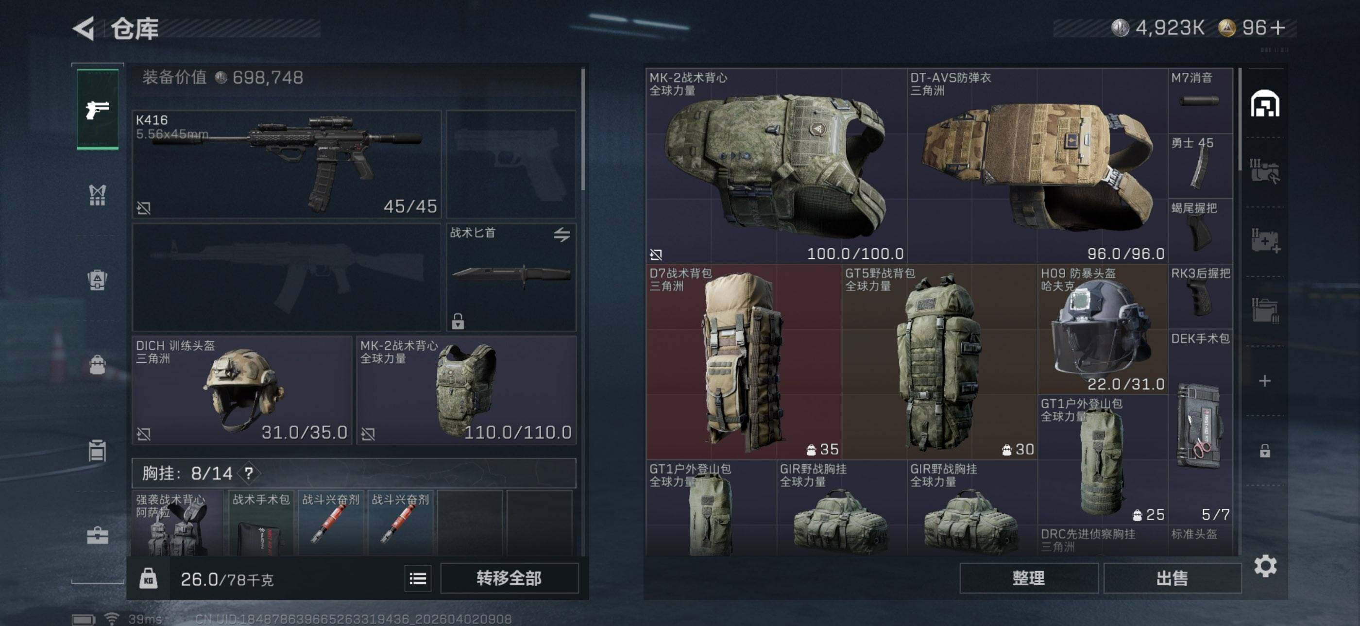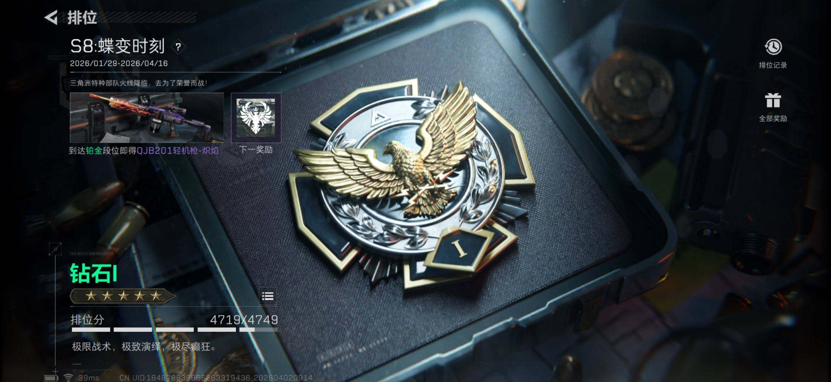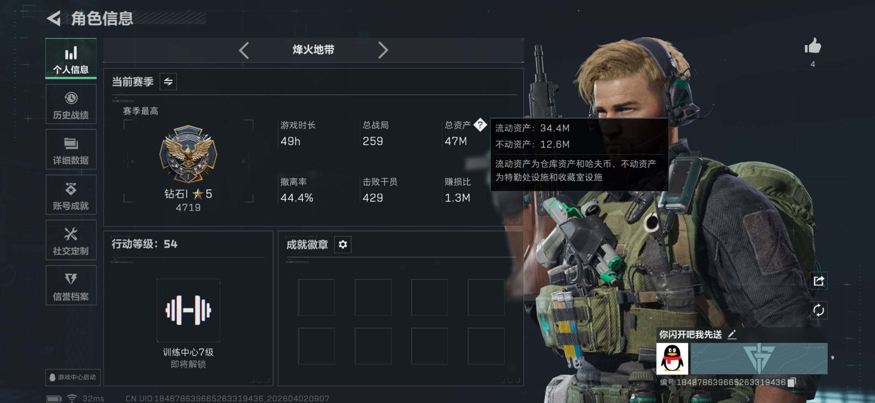 总资产(M):46M/哈夫币(K):4923K/传说枪皮数:3/全面战场等级:1_段位:无段位/烽火地带等级:54_段位:钻石/近战-黑鹰/