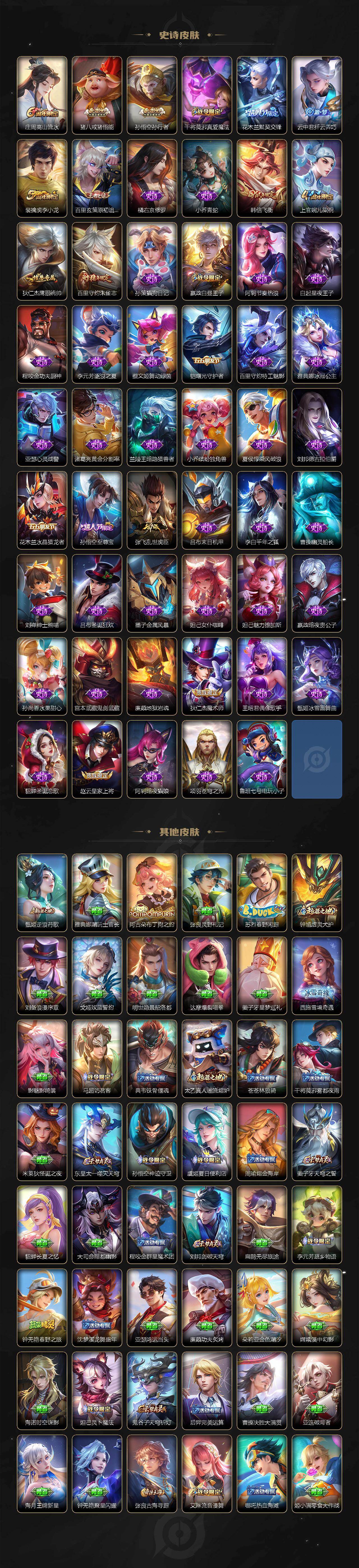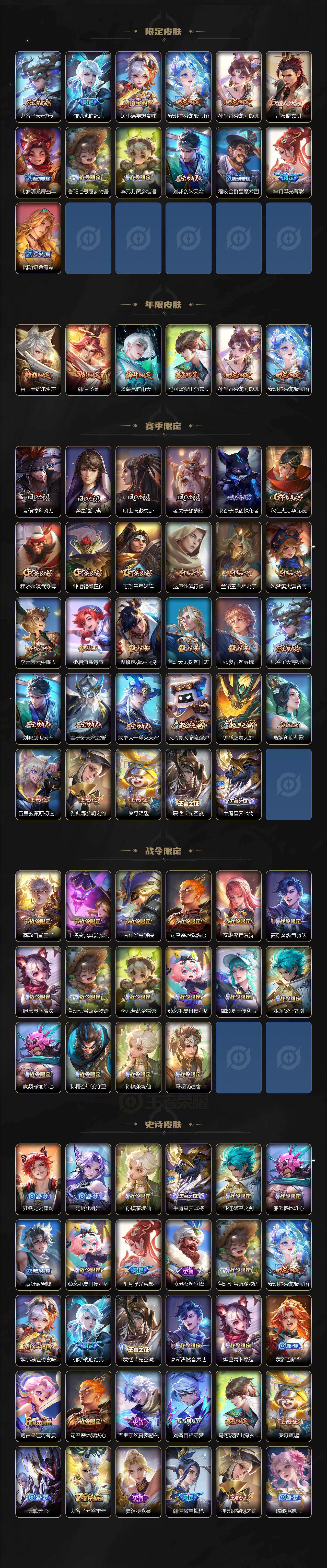 李白-鸣剑·曳影/铠-银白咏叹调/貂蝉-幻阙歌/宫本武藏-幽冥之眼/云缨-幻光神枪/桑启-鸣野蒿/吕布-曦玄引/孙尚香-乘龙·问璇玑/云缨-鹤归松栖/赵云-淬星耀世/兰陵王-默契交锋/诸葛亮-时雨天司/虞姬-启明星使/李信-一念神魔/刘备-时之恋人/干将莫邪-久胜战神/达摩-黄金狮子座/宫本武藏-地狱之眼/蒙犽-顽岩魄/蔡文姬-夏日便利店/虞姬-夏日便利店/姜子牙-天穹之誓/狄仁杰-阴阳师/