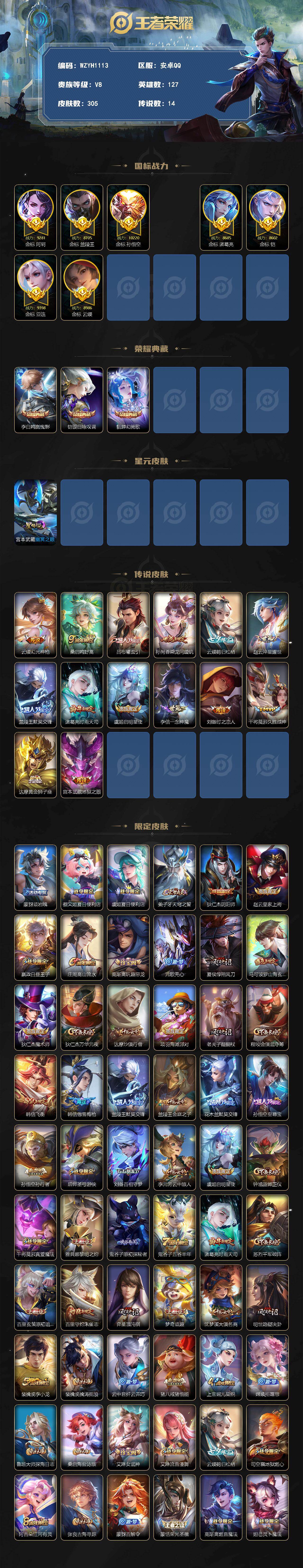 贵族8/皮肤305/典藏3/传说14/史诗82/英雄127/金标孙悟空/金标亚连/金标阿轲/金标云缨/金标兰陵王/金标诸葛亮/金标铠/金标刘备/
