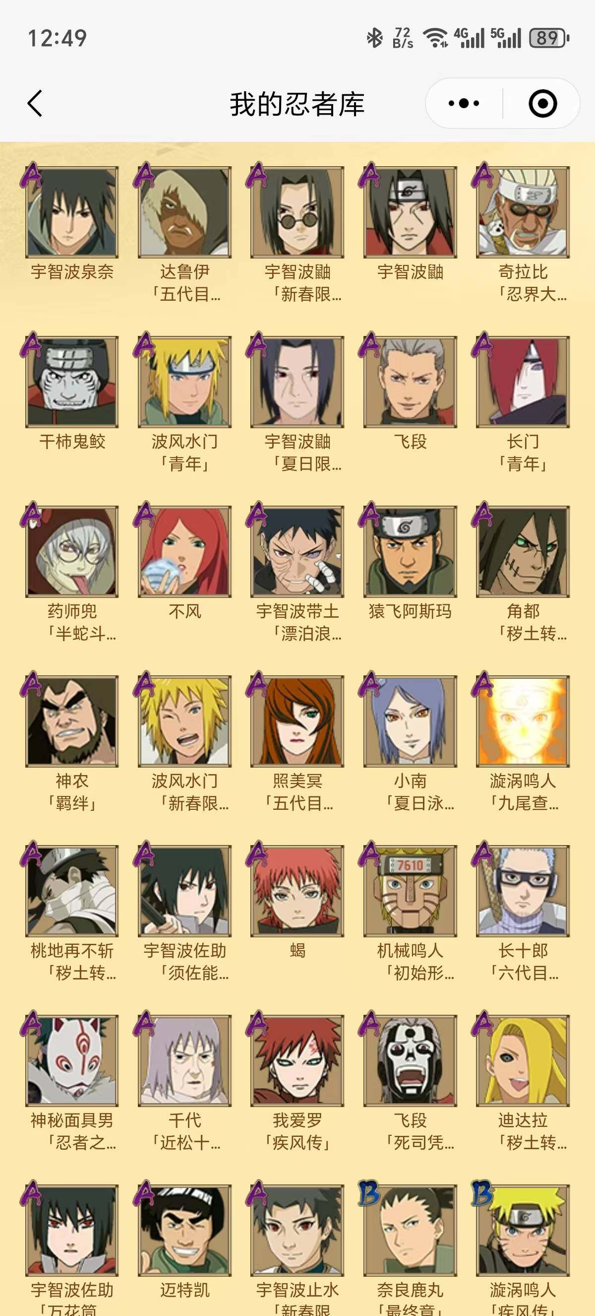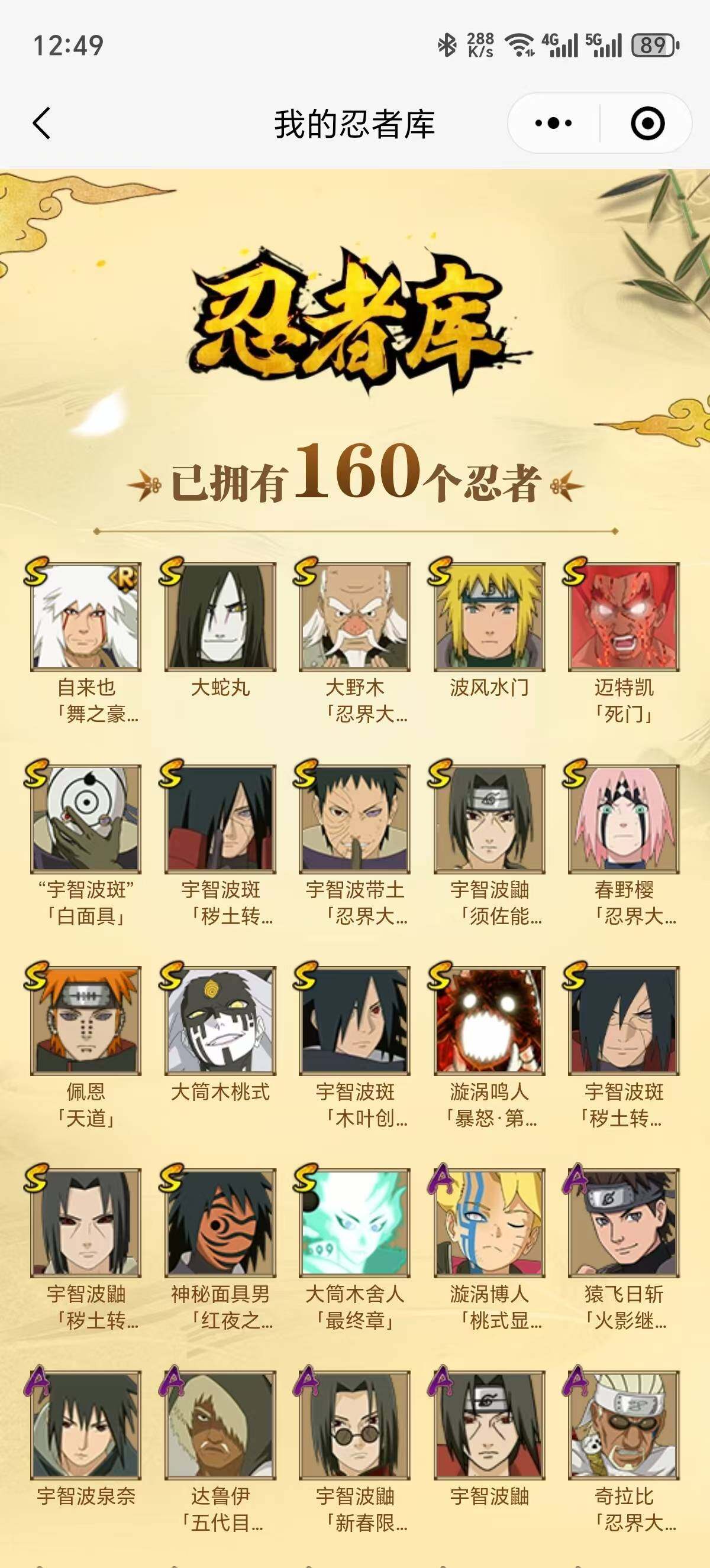 可改实名*18S级忍者数-35A级忍者数【S级忍者】:宇智波鼬「秽土转生」(3星),宇智波斑「秽土转生」(3星),宇智波斑「秽土转生·解」(3星),大野木「忍界大战」(3星),春野樱「忍界大战」(3星),宇智波带土「忍界大战」(3星),宇智波鼬「须佐能乎」(3星),宇智波斑「木叶创立」(3星),自来也「舞之豪杰」(3星),大蛇丸(3星),波风水门(3星),神秘面具男「红夜之刃」(3星),迈特凯「