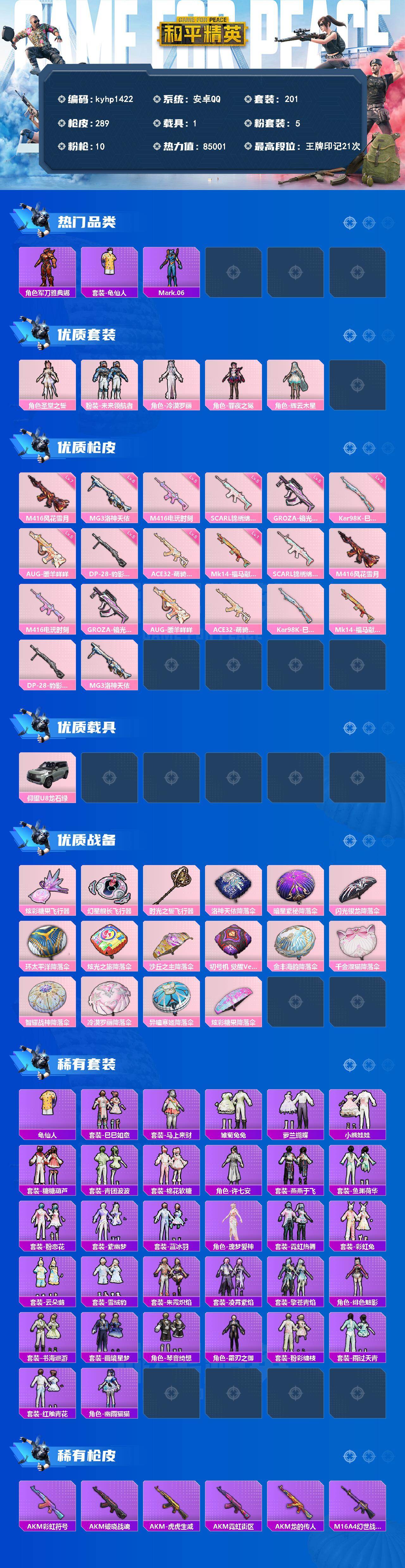 安卓 手Q-5粉装-10特效枪-1载具-3粉色飞行器-85001热力值-21王牌印记-201套装-289枪皮