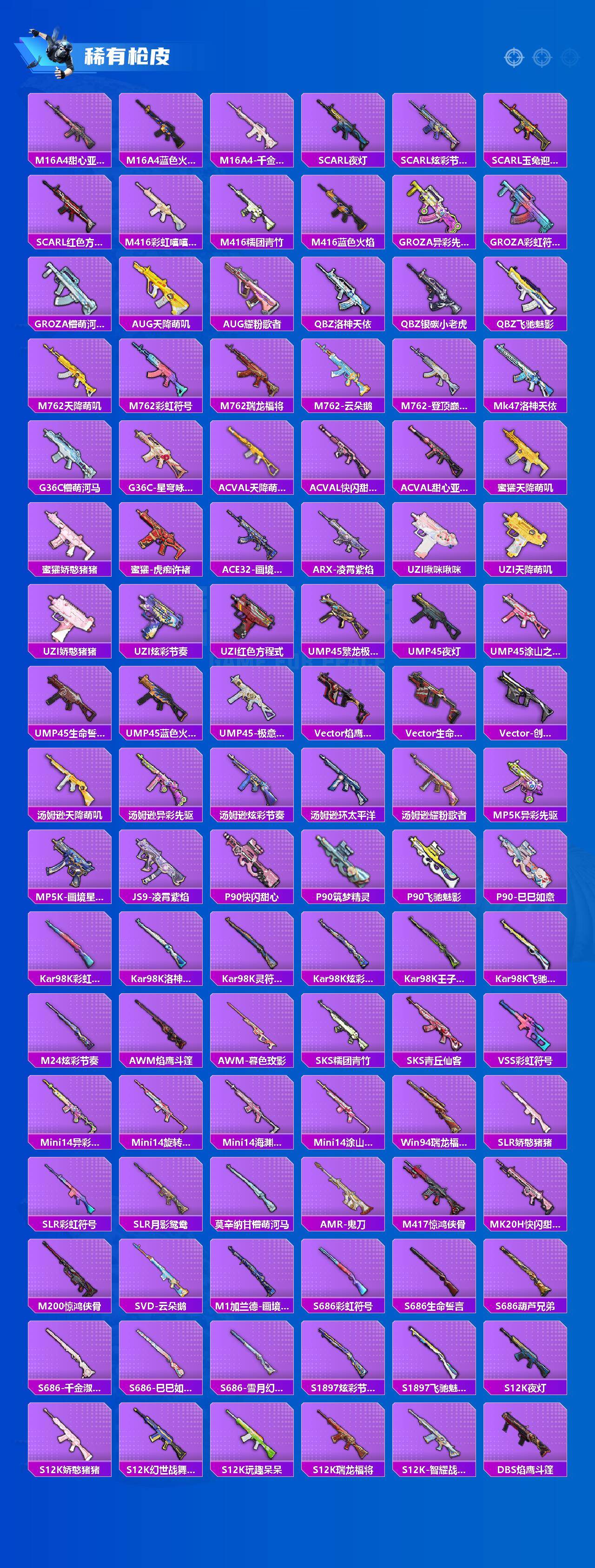 【粉色枪皮等级】:SCAR-L-锦绣绵绵(五级),M416-风花雪月(七级),M416-电玩时刻(五级),GROZA-镜光银